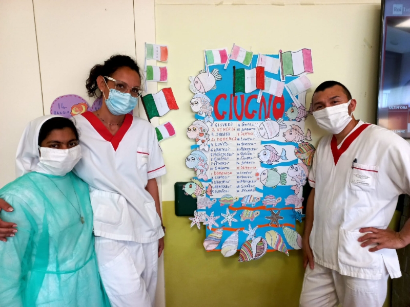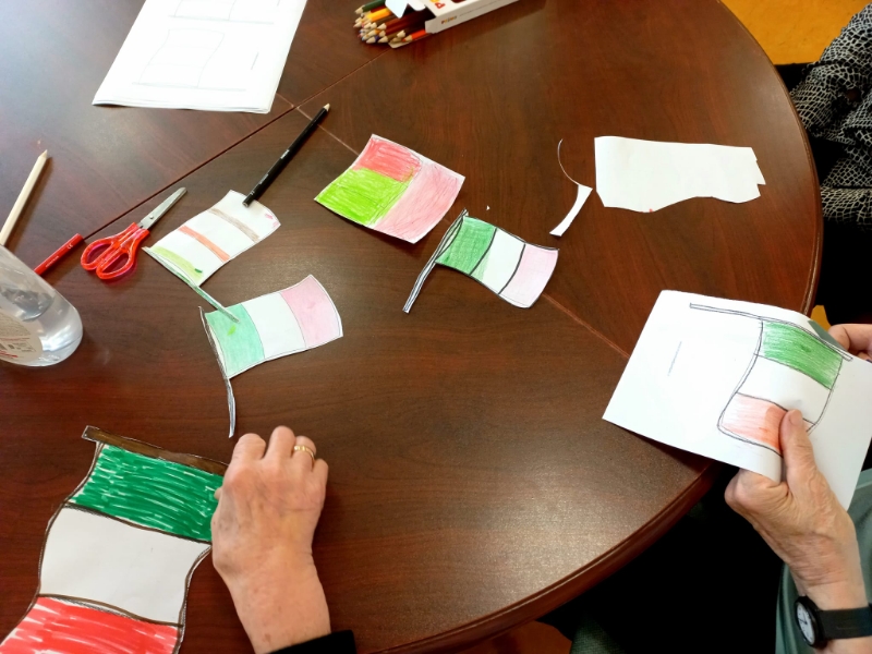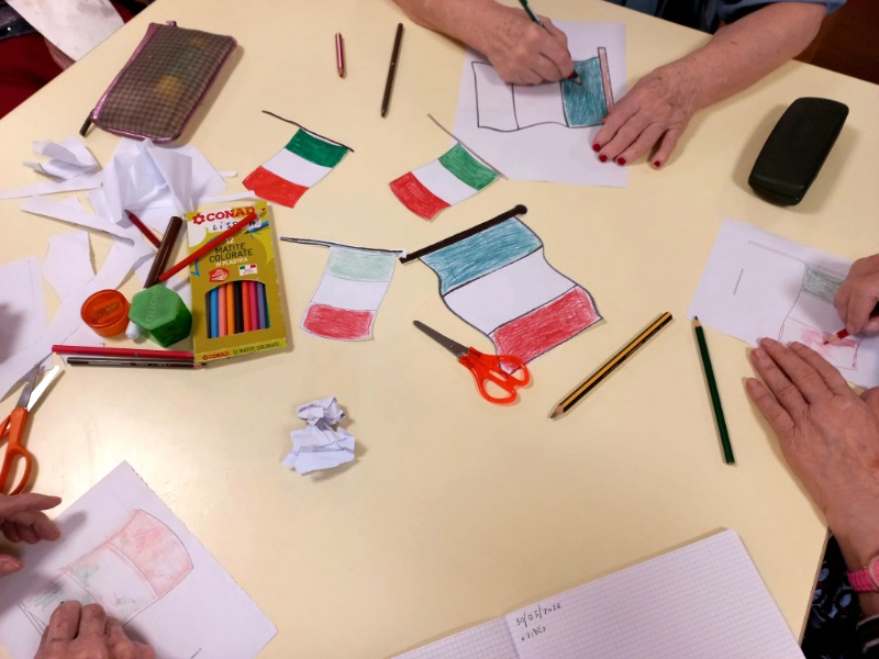 Discorriamo con i nostri ospiti sulla celebrazione del 2 giugno, mentre affiggiamo bandierine tricolore, realizzate durante i laboratori creativo-manuali, ai calendari del mese: “E una ricorrenza da non dimenticare- dicono Alberto e Nando- è finito il fascismo” ,“Mio padre era repubblicano” continua Mariarosa e Gabriella aggiunge “La Festa della Repubblica ricorda un evento importante, che è il trionfo della democrazia. Speriamo di essere sempre capaci di mantenerla”.