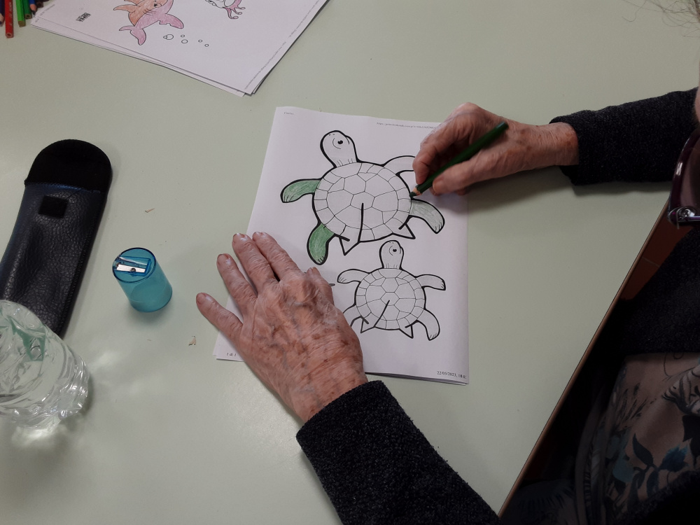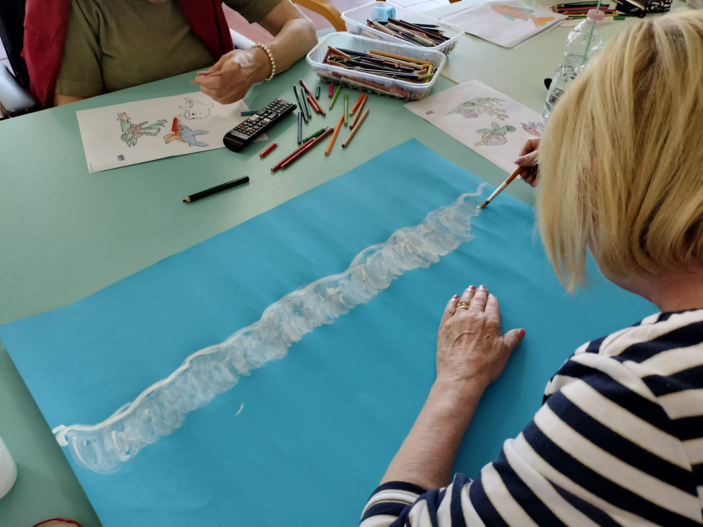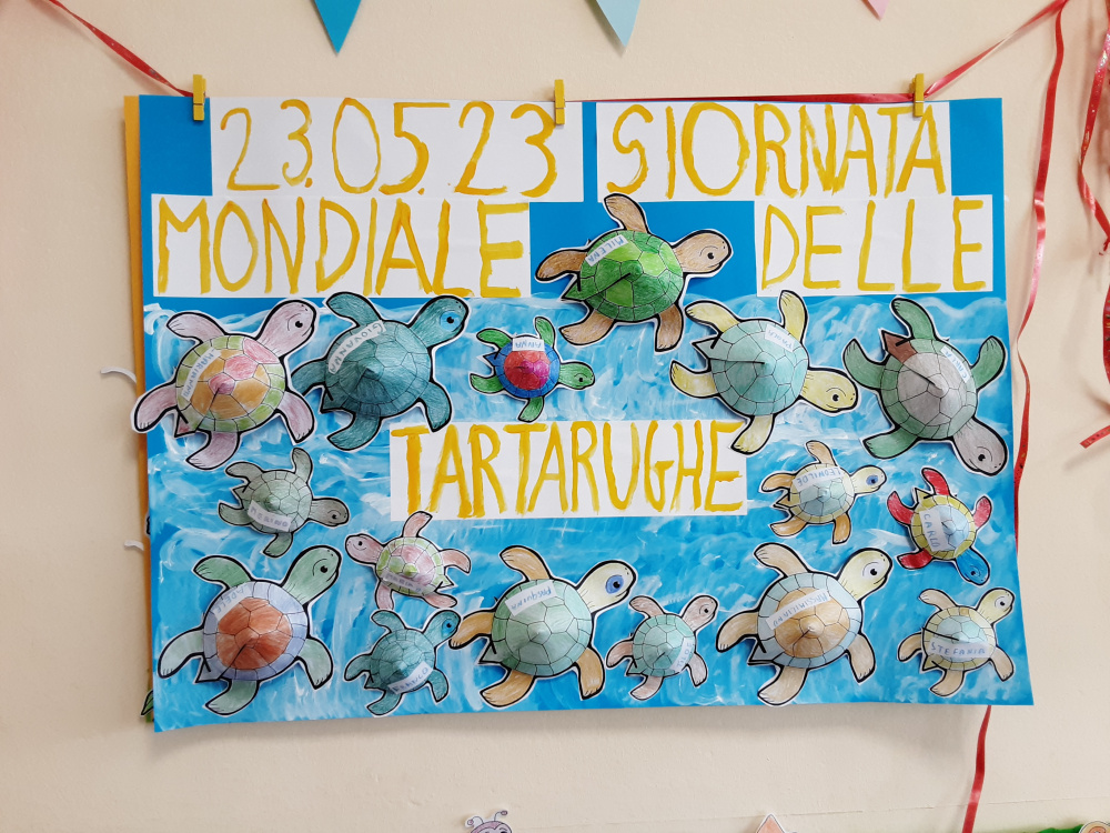 Abbiamo disegnato e dipinto le tartarughe, dando loro una forma tridimensionale, le abbiamo nominate ed adagiate in un mare azzurro, pitturato da un'ospite particolarmente ispirata, fra piccole onde spumeggianti.