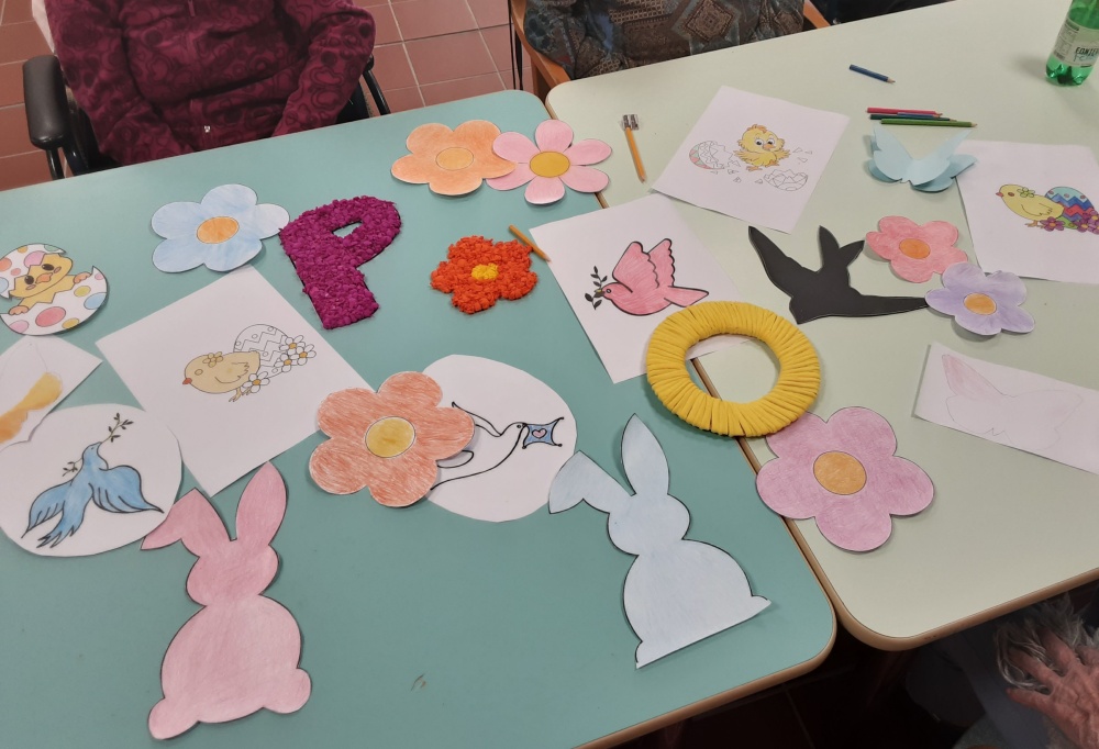 “… le violette e le pratoline sono le prime a spuntare sui prati verde tenero…” “…e poi vorrei rappresentare l'aria frizzante della primavera…” I nostri Ospiti sono inoltre al lavoro per realizzare lavoretti dedicati alla Pasqua. I laboratori pasquali sono un'occasione per divertirsi, stare insieme e per accrescere il senso di comunità. Ai tavoli delle lavorazioni stiamo preparando coniglietti e pulcini, vivacissime uova, centrotavola con uova pitturate e decorate con nastri e brillantini, da posizionare sulle tavole nel giorno della festività. Sarà inoltre confezionato un ricordo per la festività, simbolo di pace e di comunità, da donare a familiari ed amici ed a coloro che verranno in visita in struttura nei giorni di festa.