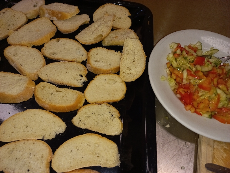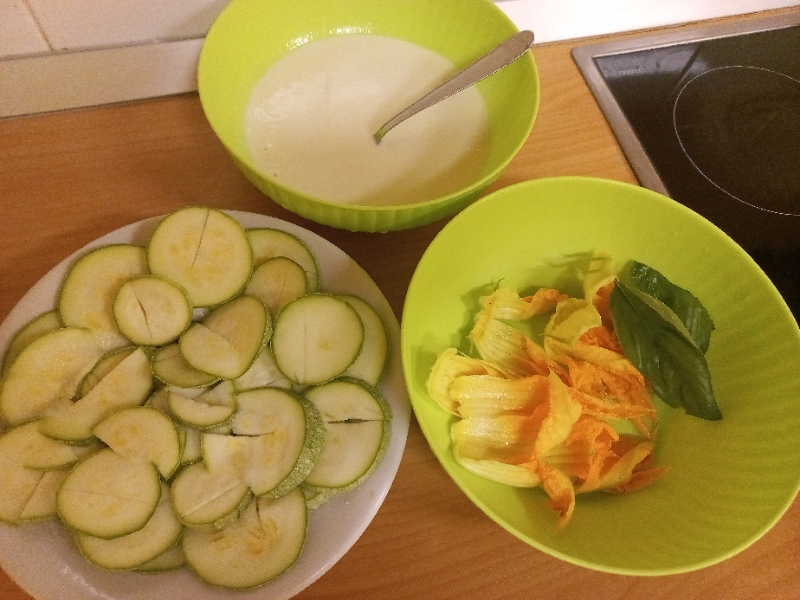 Oggi cuciniamo noi: bruschette al pesto di basilico e con julienne di pomodori e cetrioli, fritelle di fiori di zucca.