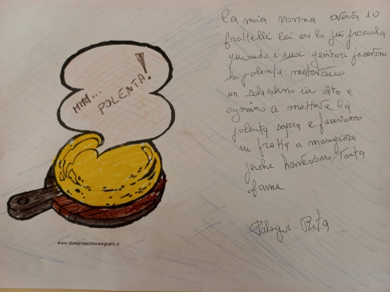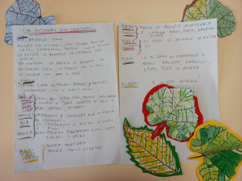 “Con la farina di castagne si fa il castagnaccio, con pinoli e uvette e il rosmarino” dicono Cristina e Chiara “e si può fare anche la polentina, con il latte o solo con l’acqua, oppure le frittelle con la ricotta”- aggiungono Maria Grazia e Maria. Jose, invece, ci descrive con minuzia di particolari la preparazione della polenta, con la farina nuova, “che poi si condiva con il sugo di coniglio o di funghi. E quella che avanzava si friggeva il giorno dopo”. Alla voce polenta corrispondono, nei ricordi degli ospiti, anche “la polenta incatenata, la polenta con lo stoccafisso” e quella tagliata con il filo che ne incideva la forma, rovesciata dal paiolo di cottura su un grande tagliere di legno. Anna, Alberto, Rita, Maddalena, Fiorella, Francesca ci parlano dei frutti che l’autunno ci regala:“i cachi, le mele, qualche grappolo d’uva che si lasciava dalla vendemmia, le noci, le nocciole, i melograni, le sorbole, le zucche e più tardi le arance e i mandarini”. Fiorella, dell’autunno, ricorda i funghi: “pinelli, porcini, gallettini, pioppetti, io ho sempre raccolto solo quelli che conoscevo bene”; e alcune erbette spontanee da cucinare: “castracane, orecchie d’asino, ginestrelli, cicerbede, rosoline”.