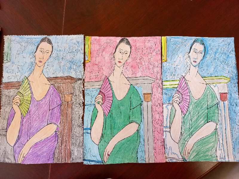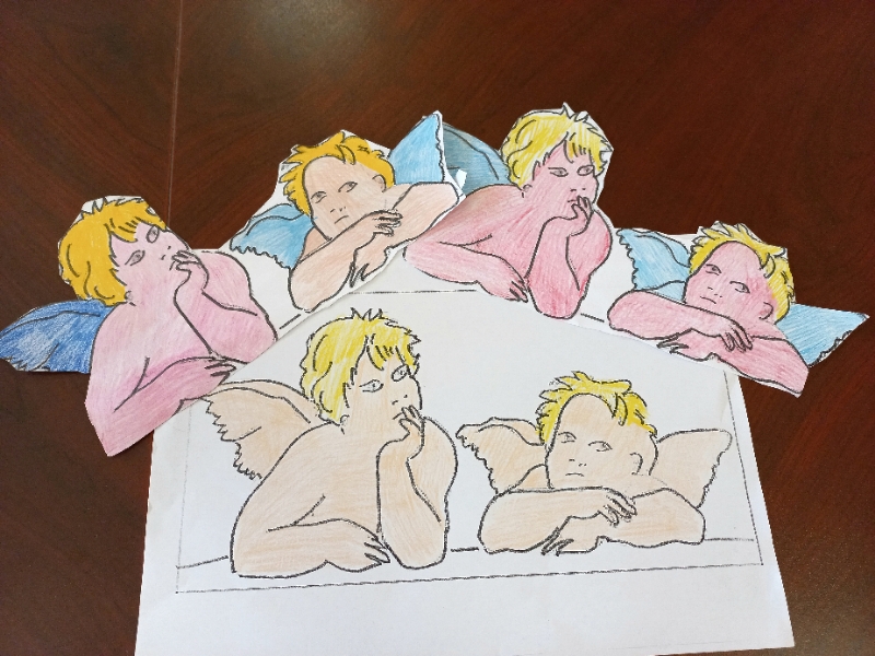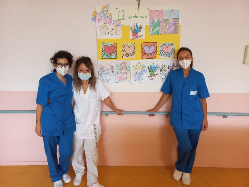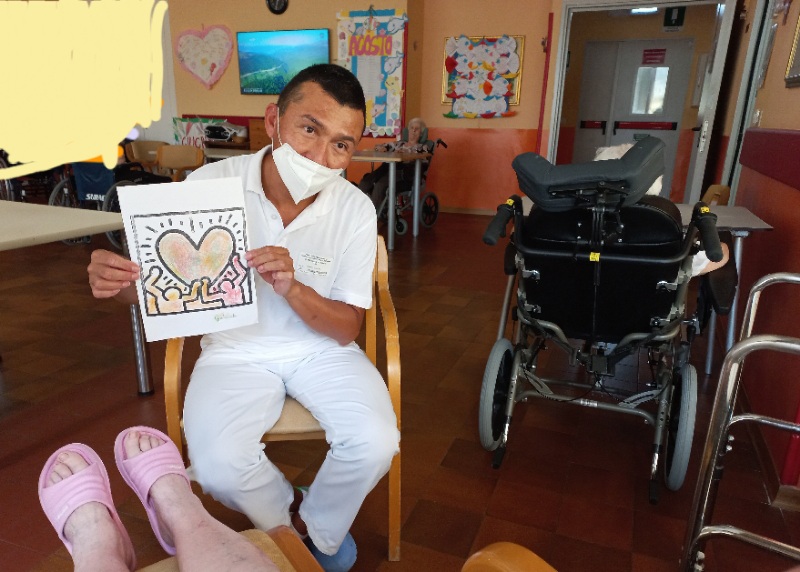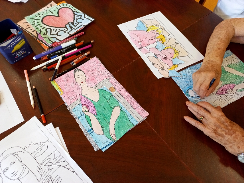 Dalla Monna Lisa al famoso cuore di Haring. Dai putti di Raffaello ai lunghi colli di Modigliani. I laboratori creativo-manuali hanno aperto le porte alle arti figurative; tramite visite su siti internet sono stati mostrati alcuni quadri celebri agli ospiti della Rsa e del Centro diurno Alzheimer. Se con la Monna Lisa abbiamo avuto gioco facile e quasi tutti l'hanno riconosciuta: “E' la Gioconda”, “Io l'ho vista a Parigi, al Louvre”, i quadri astratti sono stati apprezzati, invece, per la gamma dei colori e per l'immediatezza del messaggio, “Questo è il cuore dell'amore” dice Nedda di fronte all'opera di Haring. Dopo l'osservazione dei quadri abbiamo chiesto agli ospiti di colorarne, liberamente, le immagini riprodotte, in un'interpretazione cromatica del tutto personale, dalla quale hanno preso vita, ne ricordiamo alcune, una Gioconda azzurra, biondissimi putti e figure astratte monocromatiche.