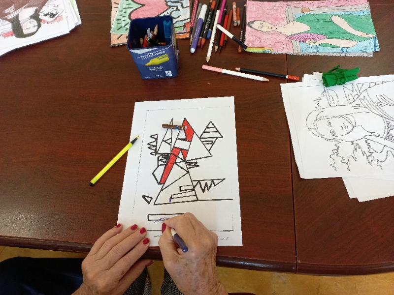 La colorazione si unisce, quindi, all'intento di avvicinare la sensibilità degli anziani alla bellezza dell'arte: una combinazione vincente, in un contesto di gruppo e di condivisione. L'attività di colorazione con matite, colori a cera e pennarelli è molto gradita ed è un cardine dei nostri programmi di animazione. Coinvolge entrambi gli emisferi cerebrali, come ci insegna la psicologia, permette di migliorare la concentrazione e di sviluppare pensieri positivi. Stimola, inoltre, le abilità oculo-manuali e cognitive, le percezioni sensoriali e la creatività. E la visione delle opere d'arte, a sua volta, incanta, migliora l'umore, regola le emozioni.