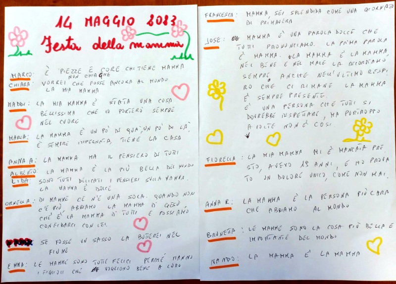 Mamma solo per te la mia canzone vola, mamma sarai con me tu non sarai più sola, così recita la famosa canzone; dalle note di beniamino Gigli ai pensieri, quelli dei nostri ospiti- che potete leggere nelle foto a corredo dell’articolo- genuini e delicati, semplici e riassuntivi sulla mamma. Pensieri condivisi con il gruppo dei compagni, esprimendo emozioni e ricordi capaci di attivare le capacità cognitive e mnemoniche e tessere benefiche reti comunicative e affettive.