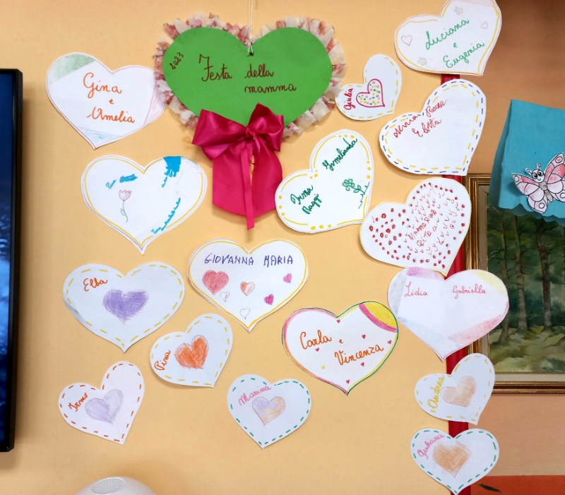 Cuori, piccoli e grandi, di cartoncino colorato o dipinti con matite e pennarelli, alcuni impreziositi con i nomi degli ospiti e delle loro mamme; e rose variopinte, sbocciate nei nostri laboratori creativo-manuali, addobbano i saloni della Rsa e del Centro diurno Alzheimer e occhieggiano dai calendari di Maggio, confezionati per dare il benvenuto al mese corrente. Cuori e rose per ricordare tutte le mamme, quelle che sono tra noi e quelle che ci hanno lasciato, alle quali è dedicata la festa di domenica prossima, la Festa della mamma.