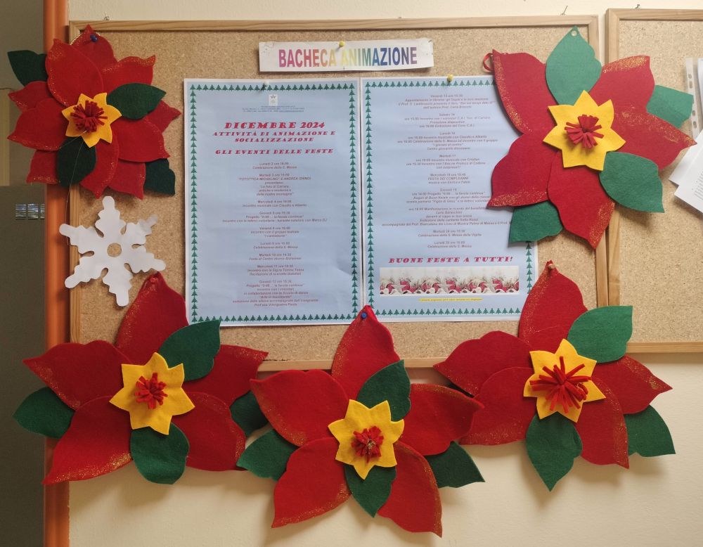Feste, musica, canti, momenti di confronto, ecc. saranno proposti quotidianamente, volti a stimolare la parte socio-relazionare dei nostri Ospiti nell'attesa del Santo Natale, accompagnandoli fino all'inizio del Nuovo Anno.