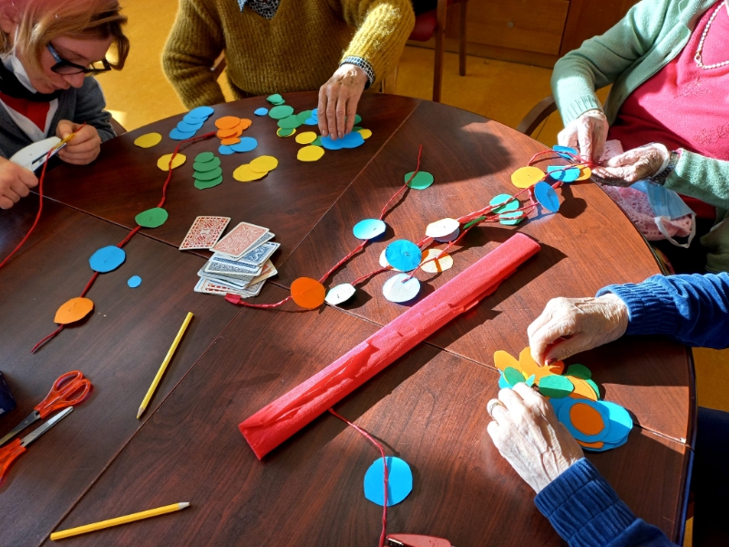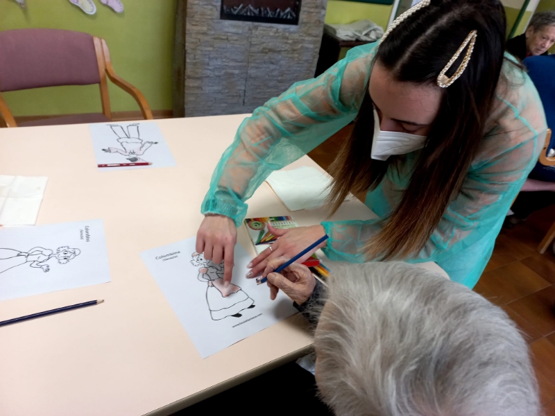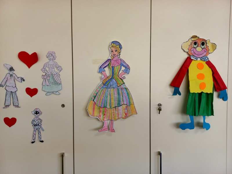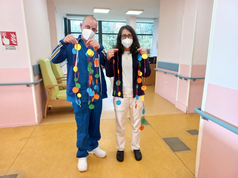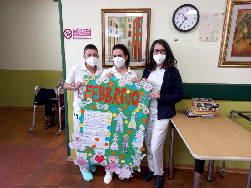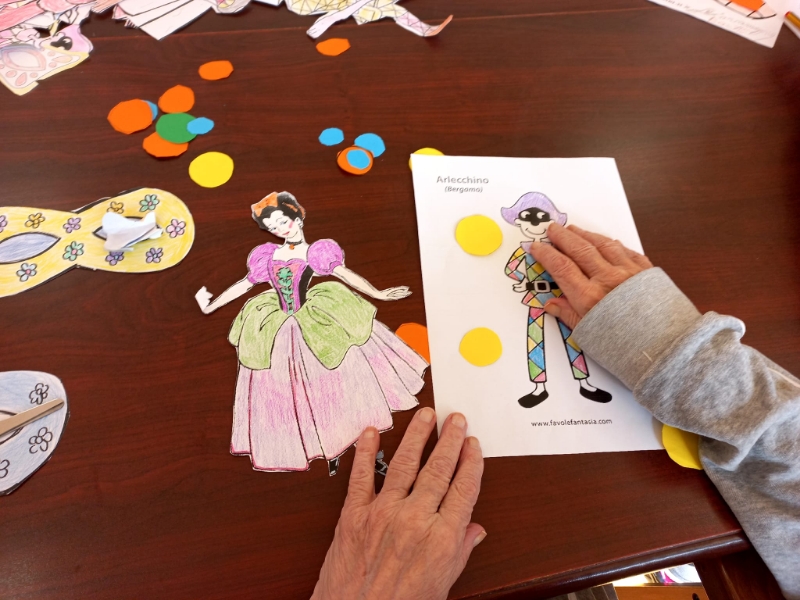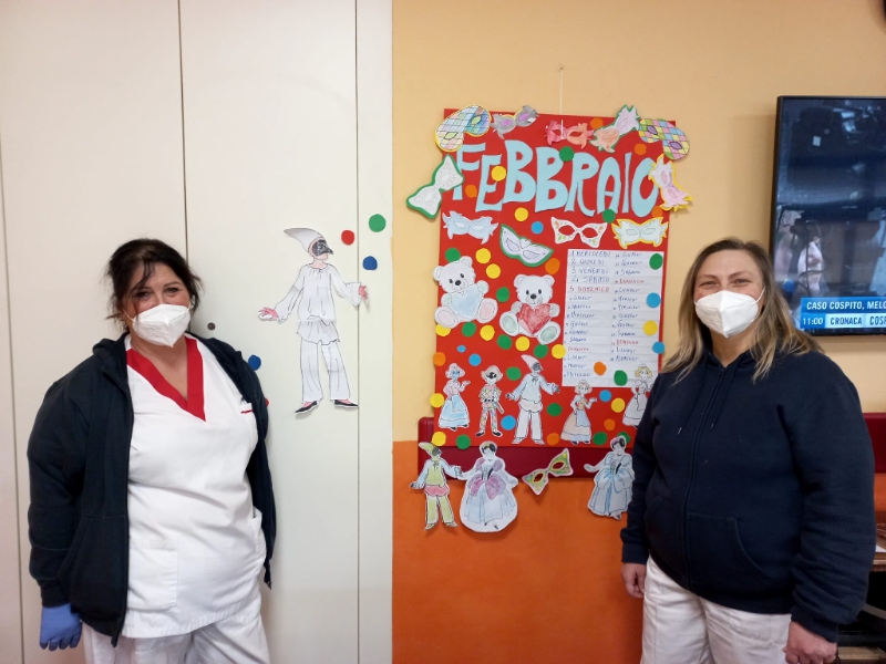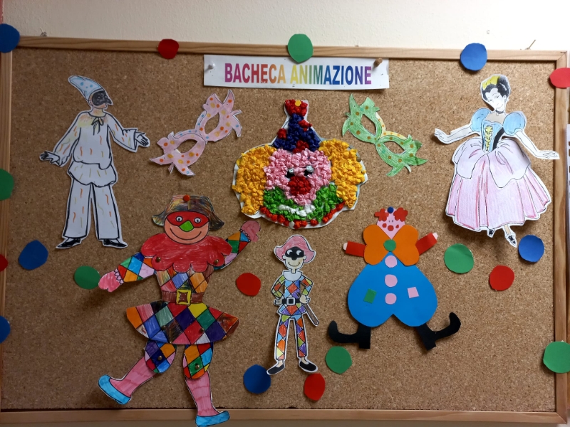 Festoni colorati e ghirlande di grandi coriandoli blu, verdi, gialli, rossi, arancioni, viola rallegrano i saloni della struttura dove sono appesi arlecchini, colombine, pulcinella, pagliacci, damigelle confezionati con carta, cartoncino, stoffa e materiale prevalentemente di riciclo. Gli ospiti hanno confezionato anche mascherine, da posizionare sugli occhi, utilizzando matite colorate, pennarelli, carta crespa, ritagli di giornale, effetti materici. Le indosseranno nel giorno di martedì grasso, in occasione del quale stiamo organizzando una festa in musica e merenda, all’insegna dello svago e del divertimento che a Carnevale non possono mancare.