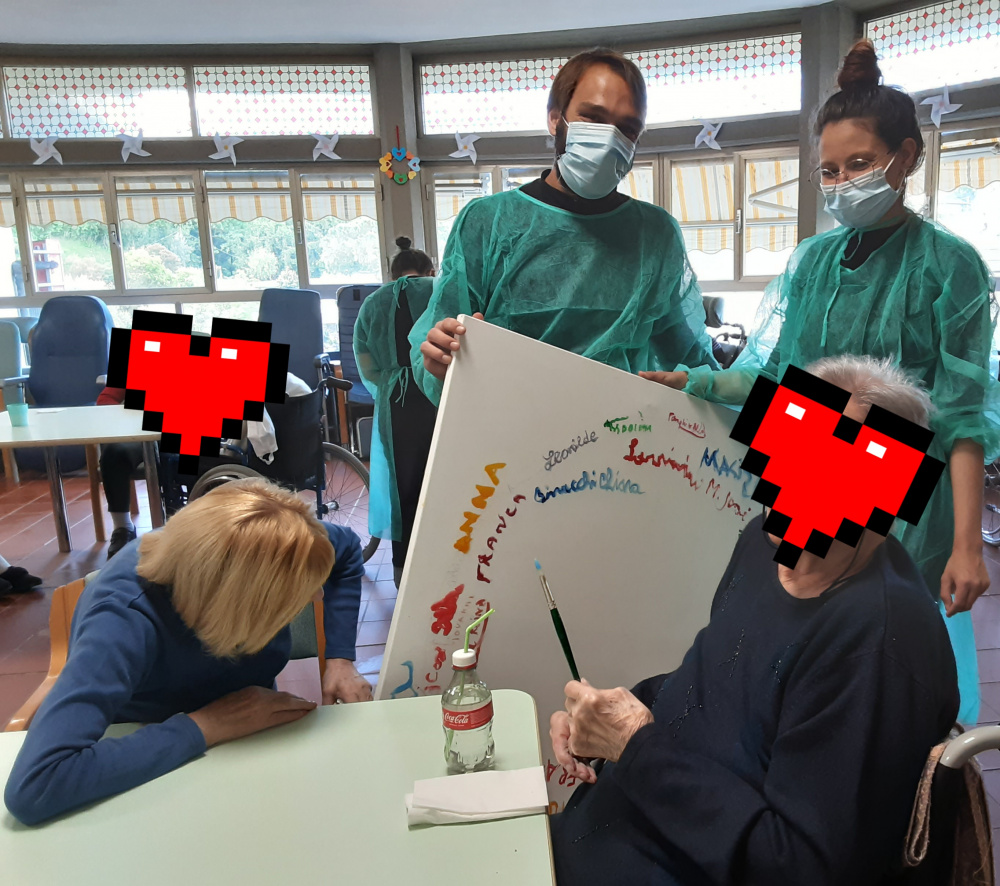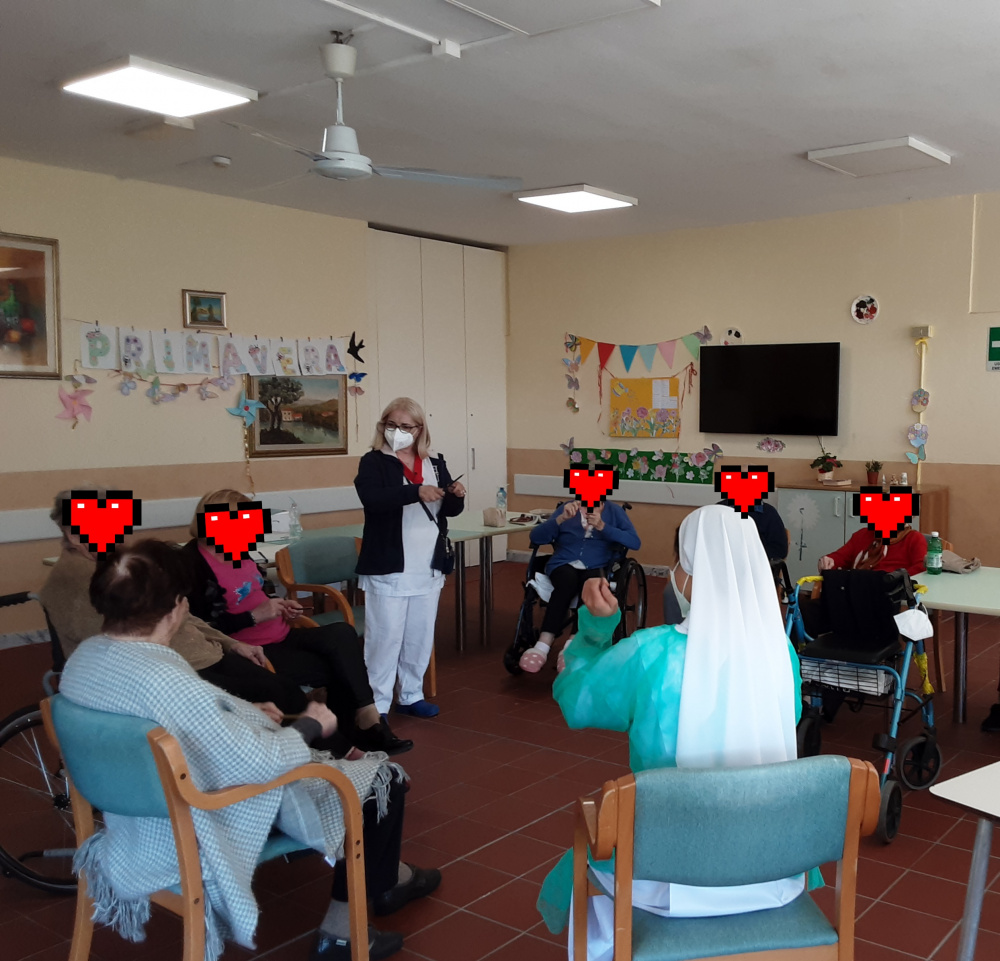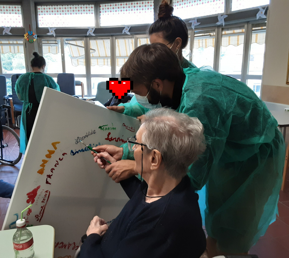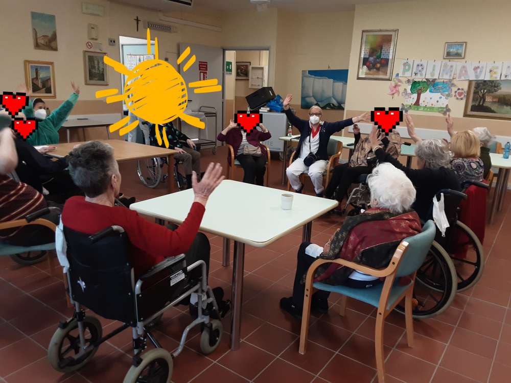 L'attività di stimolazione cognitiva in gruppo proposta durante l'attività di animazione, si propone di ridurre i momenti di inattività degli Ospiti ed il loro ritiro sociale, attraverso semplici esercizi ed attività a tema, che sono volti a conservare le capacità attuali, a migliorare la relazione con l'ambiente esterno ed a suggerire nuove strategie usufruibili per vivere meglio nel quotidiano. Il momento iniziale dell'accoglienza ha come obiettivo quello di costituire un gruppo, il più coeso possibile, che sceglie una canzone rappresentativa che sarà cantata ad inizio ed a fine incontro. Dopo gli esercizi di orientamento, sono proposti giochi di vario genere che rendono i partecipanti protagonisti della loro giornata, offrendo loro nuove prospettive e divertimento. Gli incontri si aprono con il gioco dei nomi, pronunciando a turno il proprio nome per proseguire interpretandolo con differenti modalità espressive. Seguono esercizi di stimolazione del linguaggio, di funzionalità logica, di attenzione uditiva, quiz, parole e numeri, ecc. Non mancano le attività di tipo creativo ed i momenti di ricordo per offrire un ventaglio completo ed ottenere uno dei benefici più profondi che i partecipanti possano trarre dagli incontri di stimolazione cognitiva in gruppo che è sicuramente di tipo sociale, di mutuo aiuto. E' proprio la reciprocità dell'aiuto che fa ritrovare ai singoli il piacere di far parte di un gruppo dove, si ha un ruolo attivo e dove una mancanza, è compensata con una capacità: stare insieme riduce la tensione e migliora l'umore. Gli incontri terminano con il canto del brano scelto per rappresentare il gruppo, mantenendo lo spirito di solidarietà e coesione presente dall'inizio.
