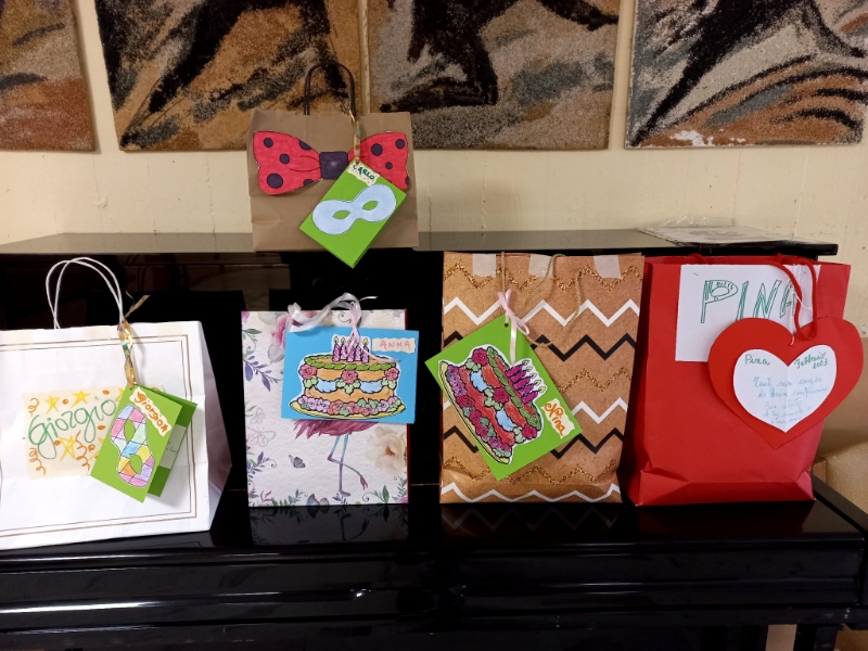 Carlo, Marco, Eufemia, Giuseppina, Giorgio, Nina, Anna e Paola hanno ricevuto gli auguri dei compagni e degli operatori, hanno consumato merende golose, hanno scartato i regali e letto i bigliettini confezionati dagli amici.