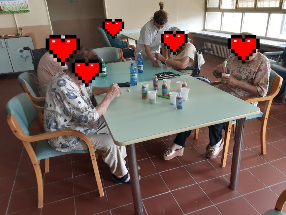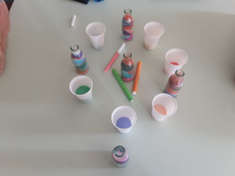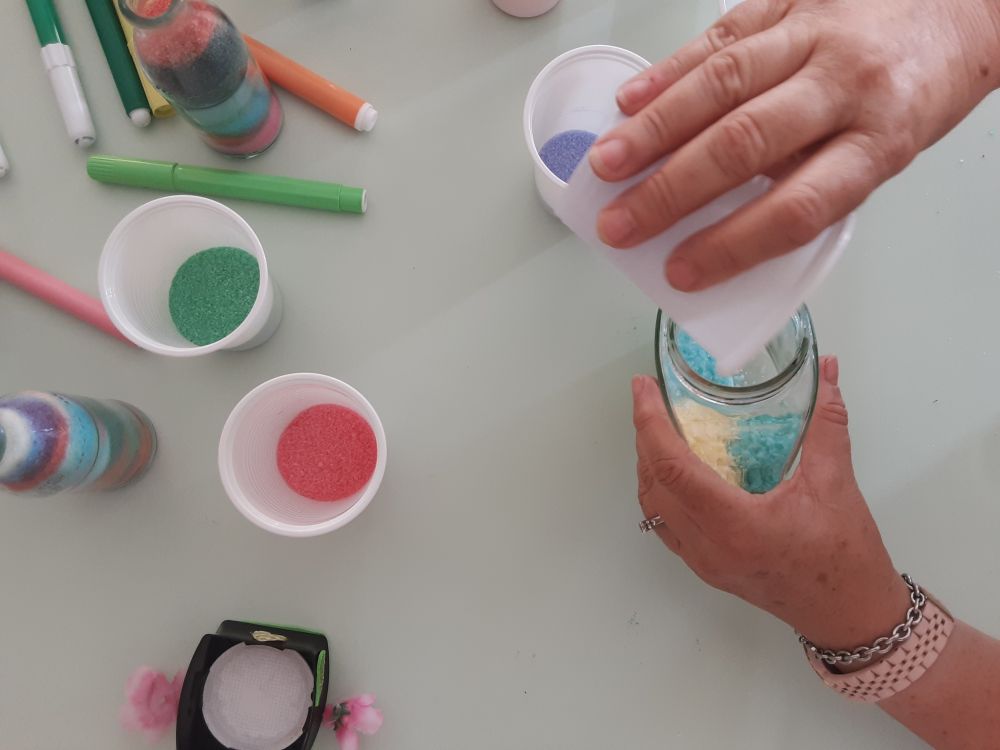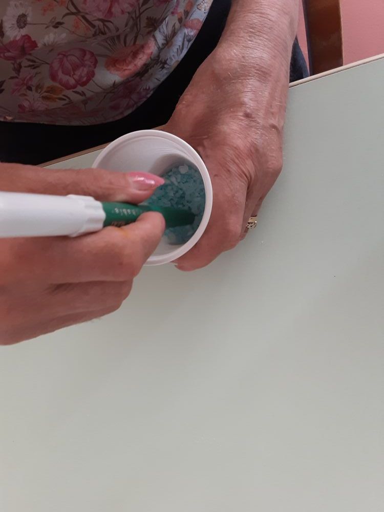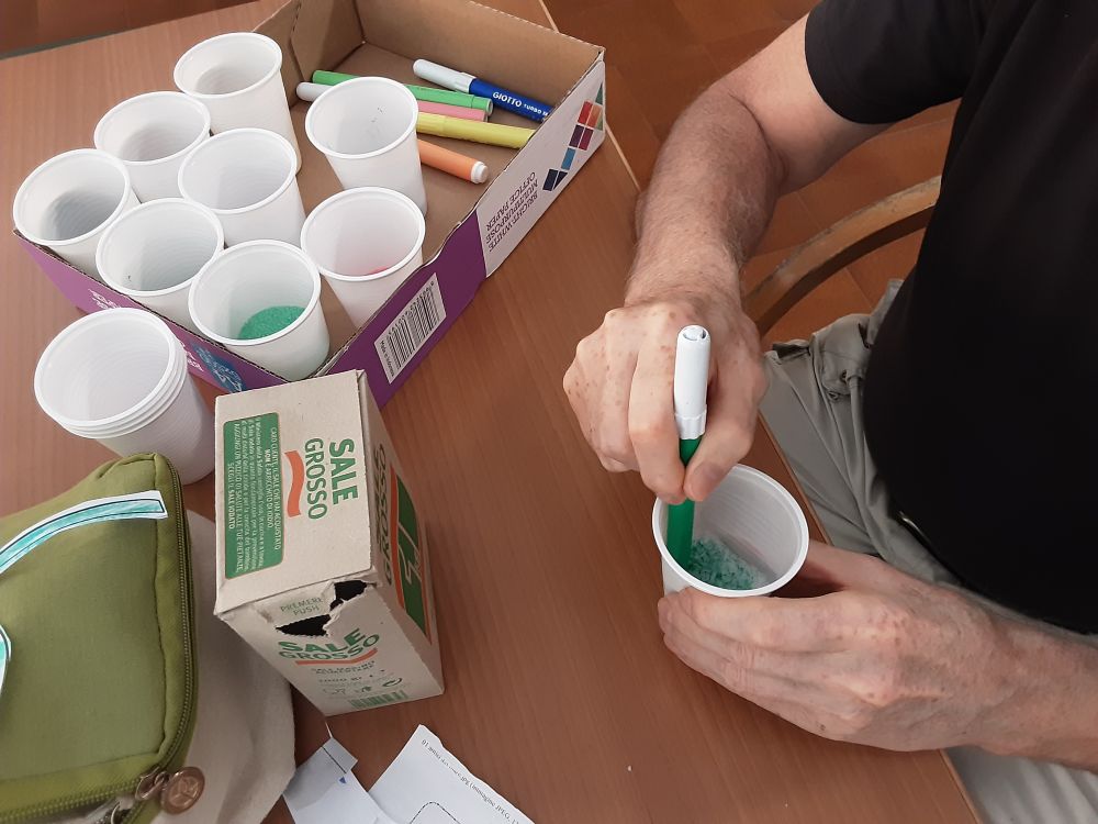 Il laboratorio ha avuto inizio partendo dalla scelta dei colori che ogni Ospite ha considerato come preferiti ed associati alle diverse sensazioni provate, in seguito condivise fra i partecipanti al gruppo ed ai compagni tutti presenti nel salone. Successivamente ognuno di loro, con dedizione e diletto, girava il pennarello del colore scelto nel bicchiere con sale fino e grosso, ottenendo così quella che qualcuno definiva “…la pozione magica…”. Con stupore i colori tipici della stagione estiva, prendevano forma all'interno del bicchiere e le tonalità ottenute, venivano mostrate con orgoglio. “…voglio preparare il verde perché mi rilassa tanto …”, “…a me occorre un bicchiere colmo di azzurro per il cielo, il mare e lo spazio infinito …”, “…io preferisco il giallo è un colore che mi rende felice …, “…il colore è energia …”. A lavorazioni concluse, gli Ospiti si sono mostrati molto contenti per quanto ottenuto ed hanno deciso di decorare e confezionare i vasetti e le bottiglie di recupero che hanno donato ai compleanni dei compagni festeggiati nel mese di luglio. Come tutte le attività creative, anche questa ha aiutato a mantenere le capacità manuali degli ospiti, rinforzato e preservato le articolazioni e la manualità fine. Le note cromatiche inoltre hanno influito sul loro stato d'animo, ed aiutato a ripristinare un buon equilibrio psico-fisico.
