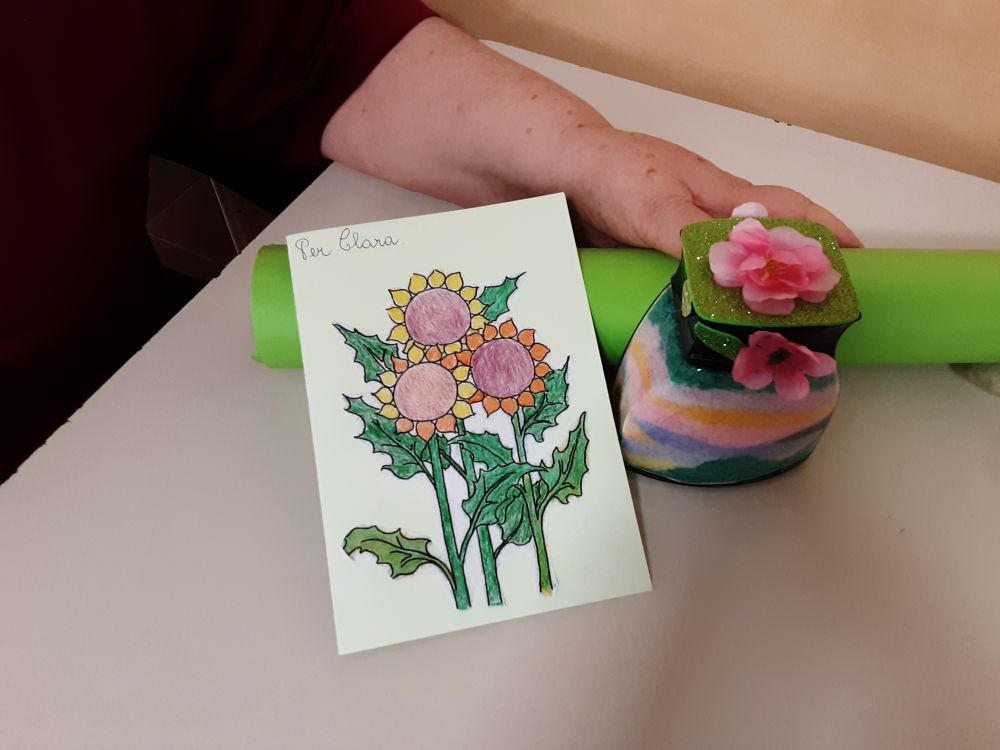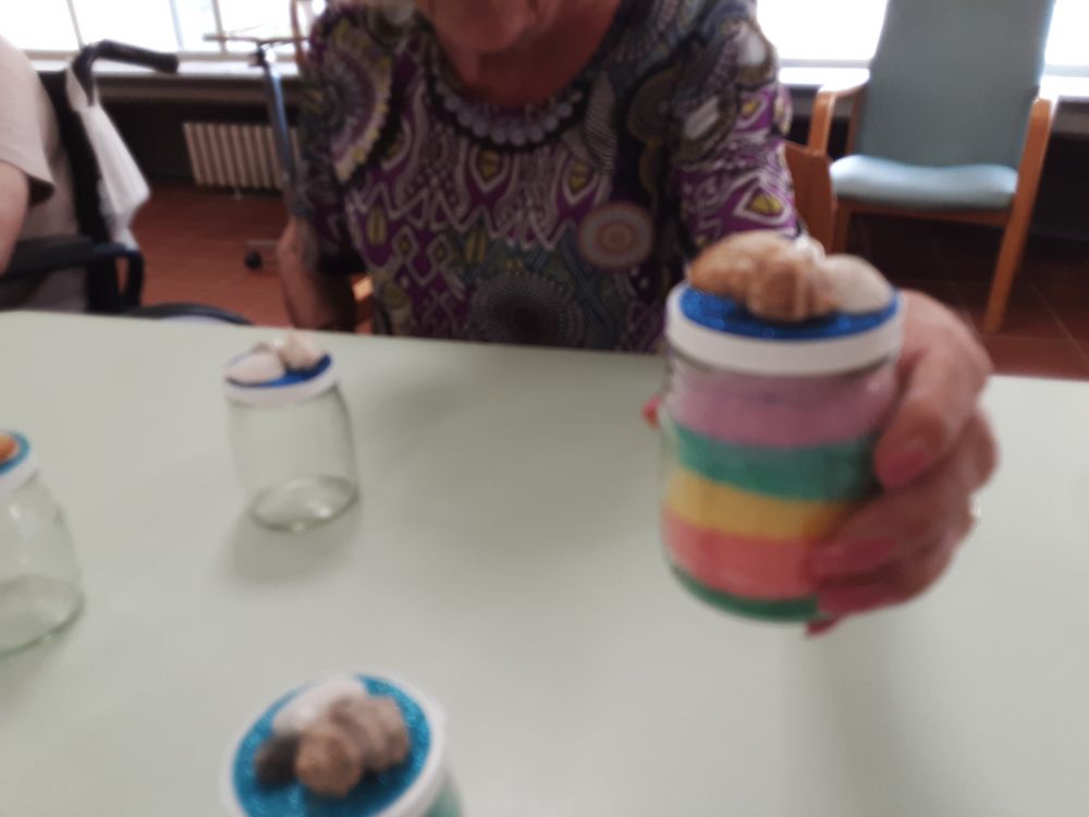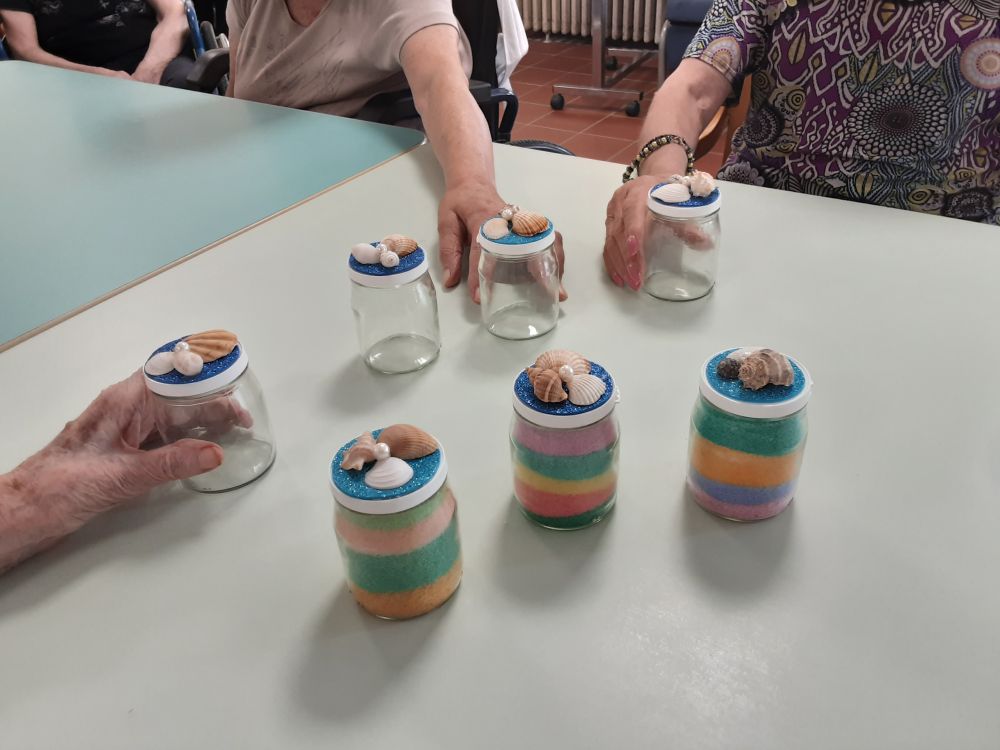 Tutti insieme, tra una chiacchiera e l'altra, hanno svolto le varie fasi per la realizzazione dei vasetti di vetro decorativi, con molto impegno, curiosità e soddisfazione. Il laboratorio ha avuto inizio partendo dalla scelta dei colori che ogni Ospite ha considerato come preferiti ed associati alle diverse sensazioni provate, in seguito condivise fra i partecipanti al gruppo ed ai compagni tutti presenti nel salone. Successivamente ognuno di loro, con dedizione e diletto, girava il pennarello del colore scelto nel bicchiere con sale fino e grosso, ottenendo così quella che qualcuno definiva “…la pozione magica…”. Con stupore i colori tipici della stagione estiva, prendevano forma all'interno del bicchiere e le tonalità ottenute, venivano mostrate con orgoglio. “…voglio preparare il verde perché mi rilassa tanto …”, “…a me occorre un bicchiere colmo di azzurro per il cielo, il mare e lo spazio infinito …”, “…io preferisco il giallo è un colore che mi rende felice …, “…il colore è energia …”. A lavorazioni concluse, gli Ospiti si sono mostrati molto contenti per quanto ottenuto ed hanno deciso di decorare e confezionare i vasetti e le bottiglie di recupero che hanno donato ai compleanni dei compagni festeggiati nel mese di luglio. Come tutte le attività creative, anche questa ha aiutato a mantenere le capacità manuali degli ospiti, rinforzato e preservato le articolazioni e la manualità fine. Le note cromatiche inoltre hanno influito sul loro stato d'animo, ed aiutato a ripristinare un buon equilibrio psico-fisico.
