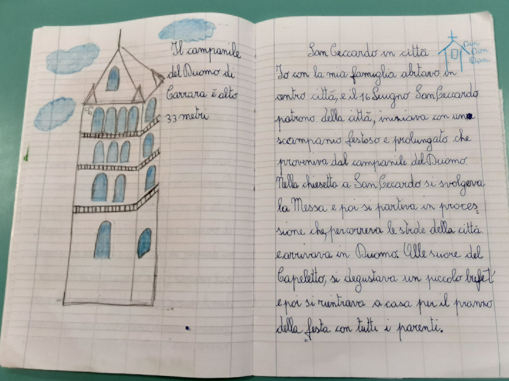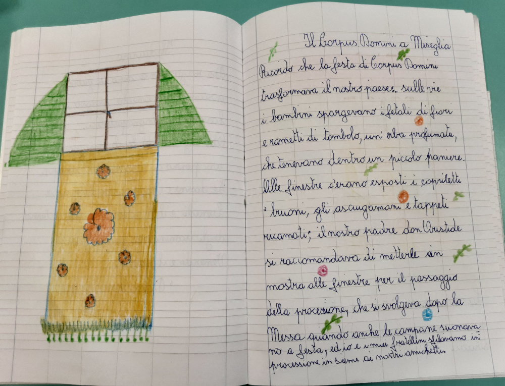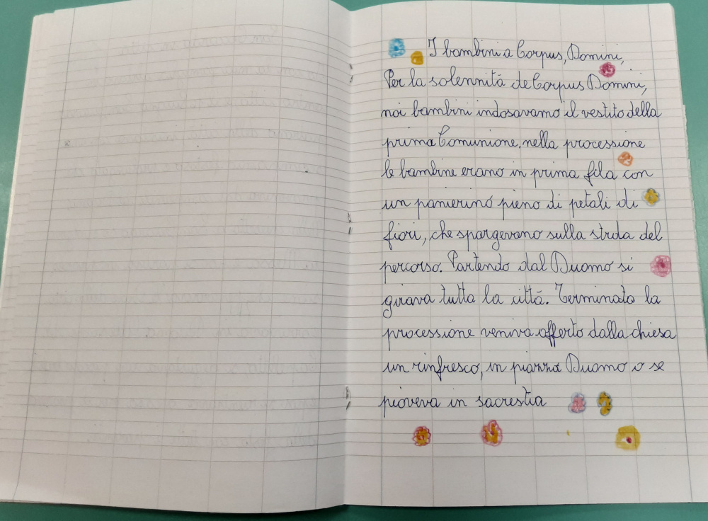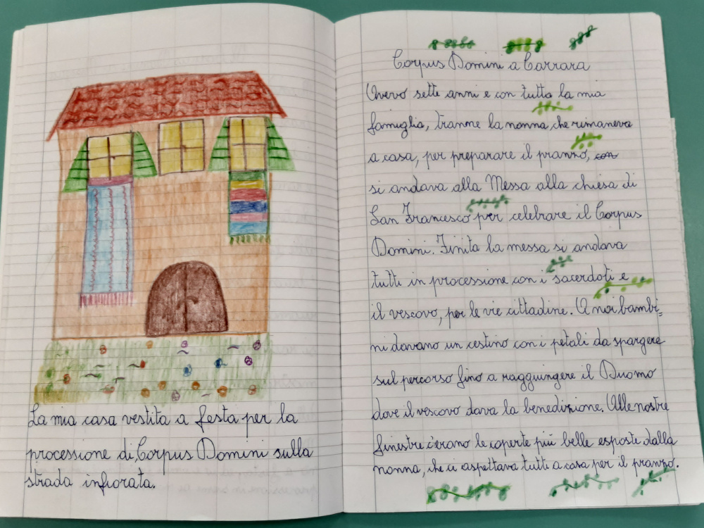 Dopo la Pasqua, il Corpus Domini, la festività solenne che onora la presenza reale di Cristo nella Eucarestia, è fortemente ricordata dagli Ospiti nei laboratori biografici, come momento di particolare partecipazione attiva ad una cerimonia religiosa, preceduta da una meticolosa preparazione. Gli Ospiti raccontano che la funzione in Duomo a Carrara, o nelle chiese dei paesi a monte, si chiudeva con un’affollata processione nella quale, dapprima avanzava la grossa croce, con i chierichetti che agitavano i turiboli fumanti di incenso, poi i bambini che avevano ricevuto la prima comunione nell’anno precedente, vestiti con gli abiti della cerimonia, portavano dei cestini colmi di petali di rose e fiori di ginestre da gettare in strada lungo il percorso della processione. Poi procedeva il baldacchino dorato, di broccato a fiori, che ospitava il Vescovo, o il sacerdote, con l’ostensorio, a forma di disco con i raggi, la banda musicale cittadina, seguita dalla folla dei fedeli. Alle finestre ed ai balconi che si affacciavano sulle vie percorse dal corteo, era raccomandato dai parroci di stendere coperte e tovaglie ricamate, tappeti e i “drapi” - gli asciugamani di lino finemente lavorati – cioè, quanto di più prezioso faceva parte del corredo della padrona di casa, in segno di festa ed omaggio al Santissimo. Nei paesi a monte usava spargere sulle vie insieme ai fiori, foglie di tombolo che emanavano un profumo particolare ed acuto che, per gli allora bambini, è l’odore della festa. La memoria olfattiva è piuttosto potente ed i profumi stimolano i ricordi negli Ospiti coinvolti che evocano così persone, luoghi e situazioni. Il 16 giugno ricorre anche la festa solenne del santo patrono S. Ceccardo, nel giorno del suo martirio, un tempo oggetto di grande venerazione per i carraresi. La tradizione popolare, tra leggenda e fantasia, narra che Ceccardo Vescovo di Luni, venne decapitato nella località situata all’estremità meridionale della città, da tempo immemorabile chiamata S. Ceccardo, dove esiste una piccola chiesa, ricostruita nel XVIII su un oratorio del ‘400, sorto dove furono rinvenute le spoglie del santo. Nell’interno della chiesa vi è una piccola stanza con l’immagine del martire e la dicitura “Chicardi” e qui sgorga la polla d’acqua purissima, perenne e miracolosa, a cui si attribuisce la virtù di guarire il male di occhi e di gola. Nei pressi della chiesetta si svolgeva anche la fiera dove gli Ospiti, i più anziani, ricordano venivano venduti pulcini e altri piccoli animali, bestiame ed anche cavalli. I racconti biografici sono per gli Ospiti un modo per comunicare, raccontare di sé e della propria vita, condividere le esperienze vissute e confrontarle con il modo di vivere odierno. Attraverso la reminescenza, interveniamo sulla memoria positiva dei presenti e, grazie ai processi di narrazione la memoria autobiografica ed il senso del sé, vengono stimolati e si attivano emozioni e risorse, socializzazione e condivisione.