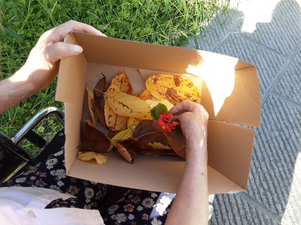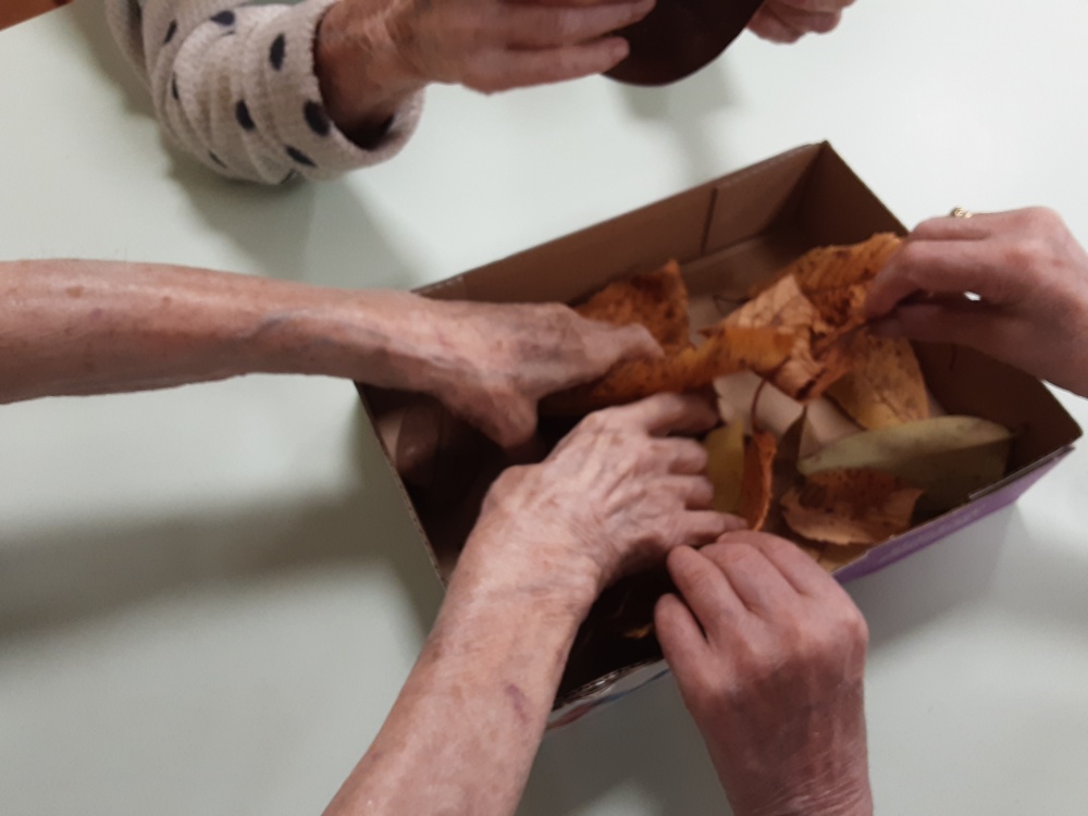 La stagione autunnale è ormai prossima ed abbiamo scelto le foglie raccolte, con alcuni dei nostri Ospiti, nel nostro giardino che diventano il punto di partenza per una esplorazione sensoriale degli elementi della natura. Le abbiamo poste in una scatola, dove andremo ad aggiungere nuovi elementi per realizzare una “sensory box”, e toccandole ne abbiamo sentito il suono. In seguito, quando saranno secche, le sbricioleremo con le mani e con i pezzetti faremo un collage.