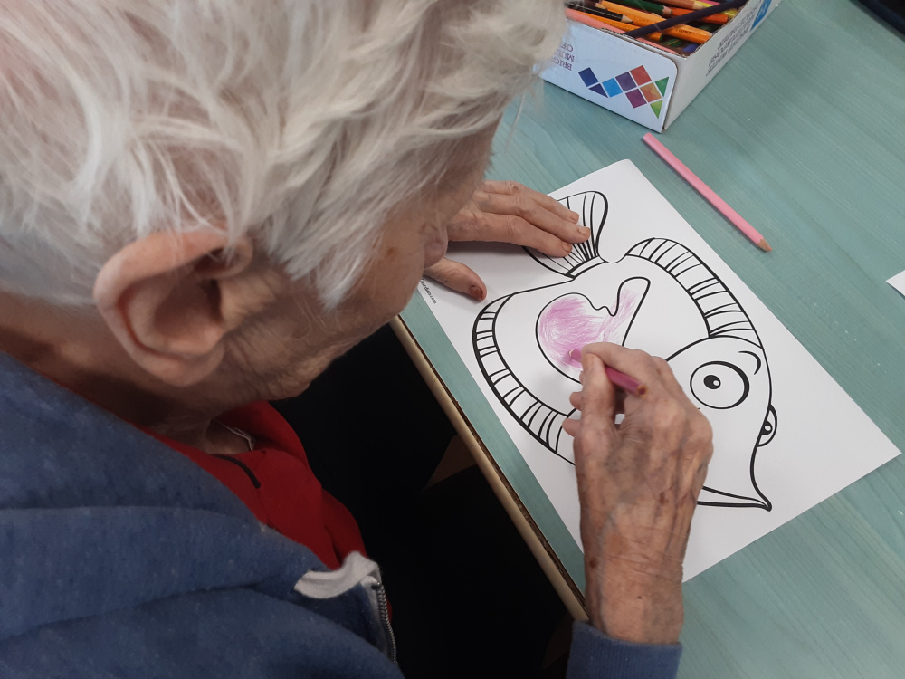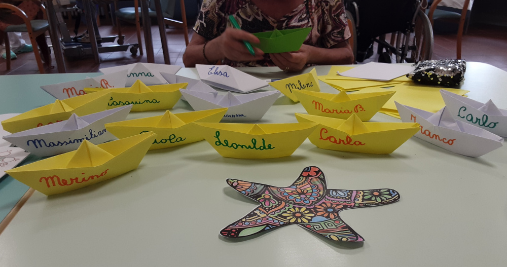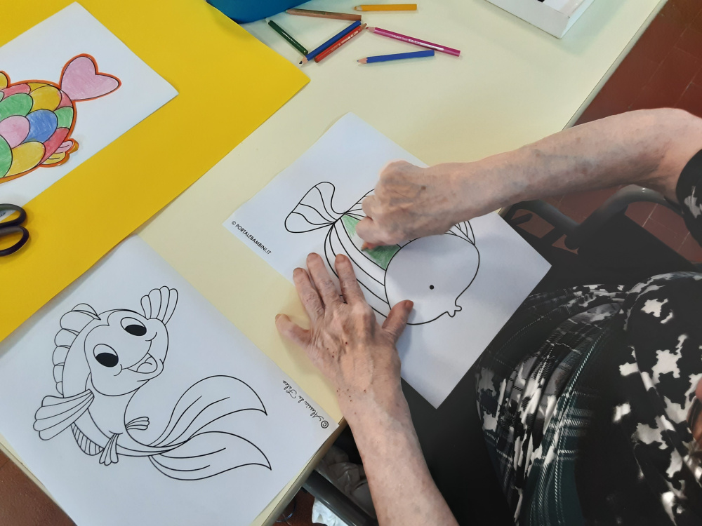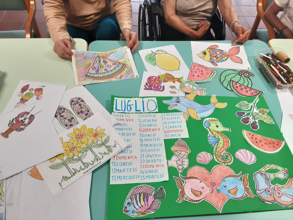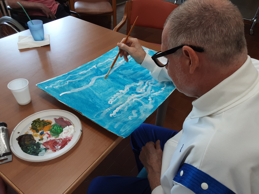Il laboratorio artistico-pittorico-espressivo, permette lo sviluppo ed il mantenimento delle capacità manuali-creative degli Ospiti, che attraverso la realizzazione di “piccole opere d’arte”, eseguite con varie tecniche e differenti materiali, saranno fonte di soddisfazione nonché veicolo di espressione della propria emotività. Gli obiettivi del laboratorio sono molteplici, l’offerta di un momento strutturato, è volto a: favorire un’opportunità di socializzazione ed integrazione; creare curiosità ed interesse per i vari mezzi espressivi proposti; mantenere le abilità manuali ed il piacere del fare; stimolare il desiderio di scoprire attitudini; offrire la sensazione di spensieratezza che si attiva nei momenti di condivisione; stimolare i ricordi e la loro condivisone, un’opportunità per la nascita di nuove amicizie. Sollecitare la partecipazione degli Ospiti alle attività collettive, ci permette quindi di operare con l’obiettivo di creare un clima di collaborazione e amicizia. La natura delle attività è differente e dipende soprattutto, dalle capacità di movimento degli Ospiti. I frequenti laboratori creativi contrastando l’isolamento e, talvolta il senso di inutilità, permettono di incoraggiare l’Ospite; di gestire e rallentare il declino; stimolare i sensi, la vista ed il tatto per aumentare la concentrazione; mantenere alto l’umore; rafforzare il senso di controllo e l’autostima. Il laboratorio del periodo a tema estate-mare, ha visto gli Ospiti realizzare, con grande impegno e divertimento, colorate barchette di carta, pesci e fondi marini dipinti col pennello esibiti con soddisfazione ed orgoglio. Sono stati inoltre realizzati i nuovi calendari mensili per i saloni, che oltre ad avere una funzione decorativa, aiutano gli Ospiti ad orientarsi nel tempo.