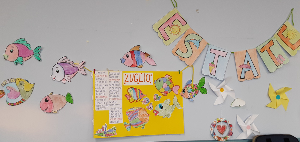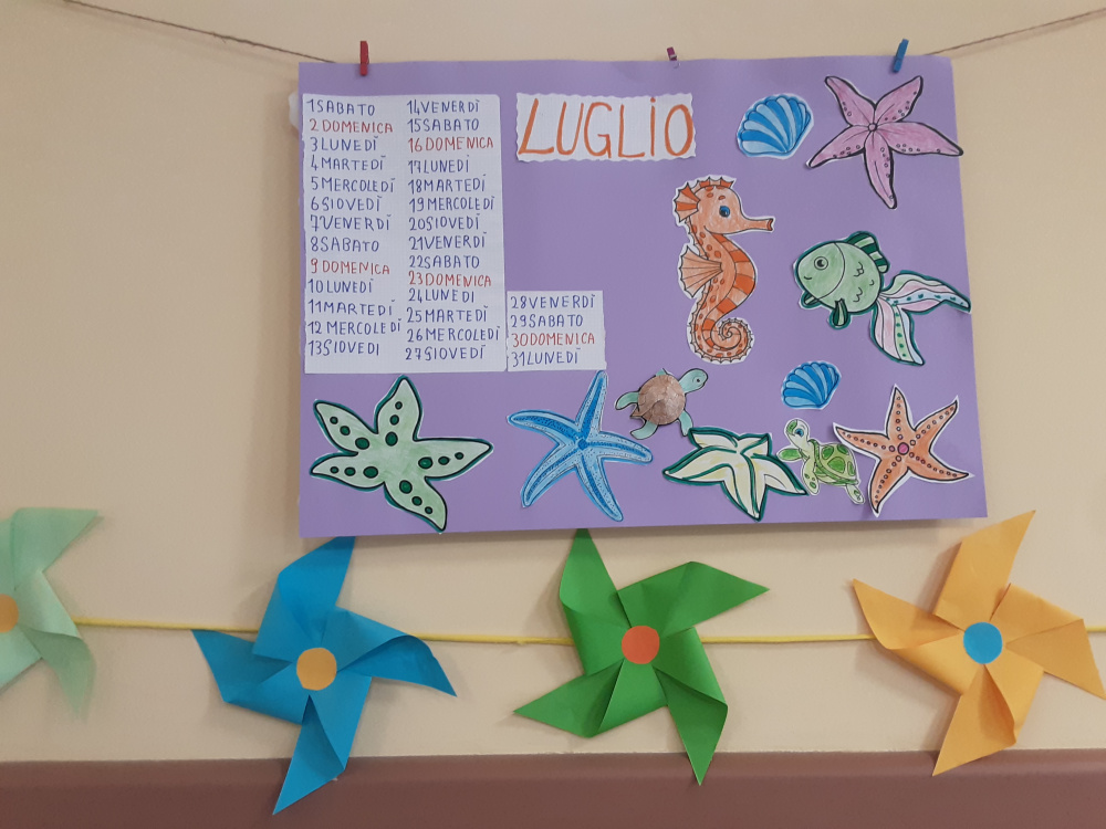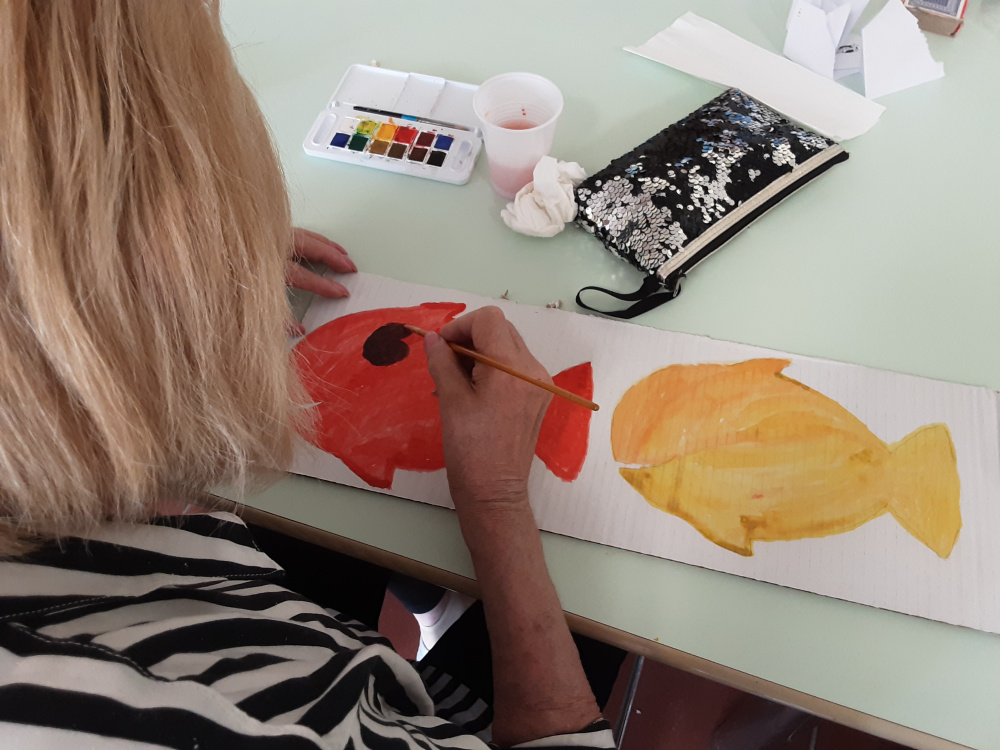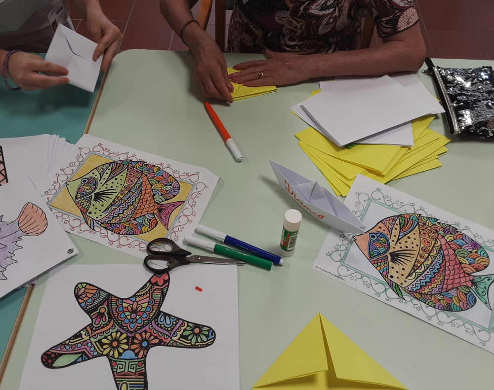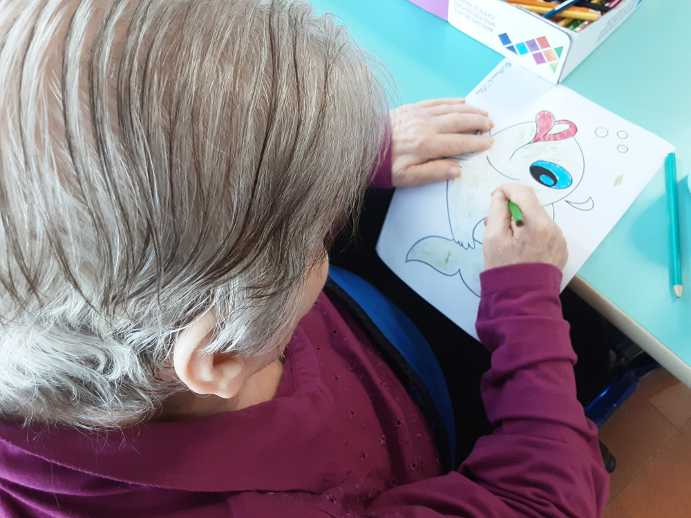 Il laboratorio artistico-pittorico-espressivo, permette lo sviluppo ed il mantenimento delle capacità manuali-creative degli Ospiti, che attraverso la realizzazione di “piccole opere d’arte”, eseguite con varie tecniche e differenti materiali, saranno fonte di soddisfazione nonché veicolo di espressione della propria emotività. Gli obiettivi del laboratorio sono molteplici, l’offerta di un momento strutturato, è volto a: favorire un’opportunità di socializzazione ed integrazione; creare curiosità ed interesse per i vari mezzi espressivi proposti; mantenere le abilità manuali ed il piacere del fare; stimolare il desiderio di scoprire attitudini; offrire la sensazione di spensieratezza che si attiva nei momenti di condivisione; stimolare i ricordi e la loro condivisone, un’opportunità per la nascita di nuove amicizie. Sollecitare la partecipazione degli Ospiti alle attività collettive, ci permette quindi di operare con l’obiettivo di creare un clima di collaborazione e amicizia. La natura delle attività è differente e dipende soprattutto, dalle capacità di movimento degli Ospiti. I frequenti laboratori creativi contrastando l’isolamento e, talvolta il senso di inutilità, permettono di incoraggiare l’Ospite; di gestire e rallentare il declino; stimolare i sensi, la vista ed il tatto per aumentare la concentrazione; mantenere alto l’umore; rafforzare il senso di controllo e l’autostima. Il laboratorio del periodo a tema estate-mare, ha visto gli Ospiti realizzare, con grande impegno e divertimento, colorate barchette di carta, pesci e fondi marini dipinti col pennello esibiti con soddisfazione ed orgoglio. Sono stati inoltre realizzati i nuovi calendari mensili per i saloni, che oltre ad avere una funzione decorativa, aiutano gli Ospiti ad orientarsi nel tempo.