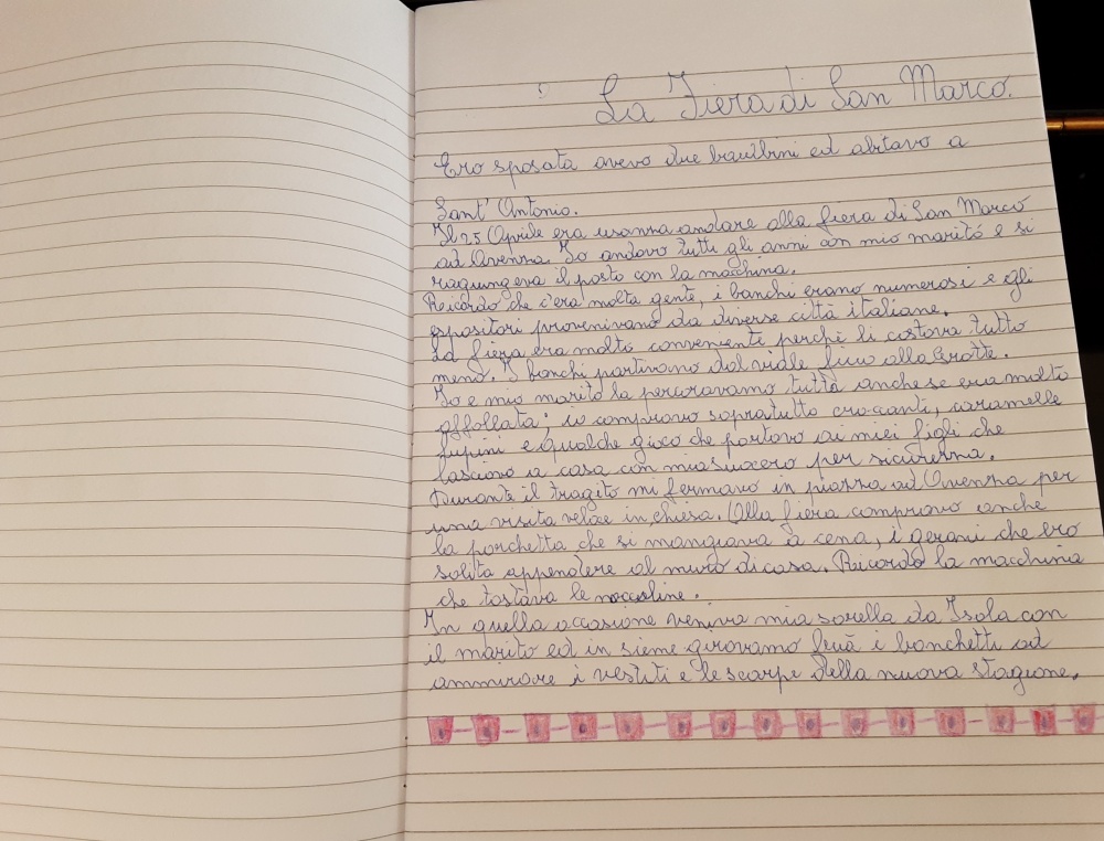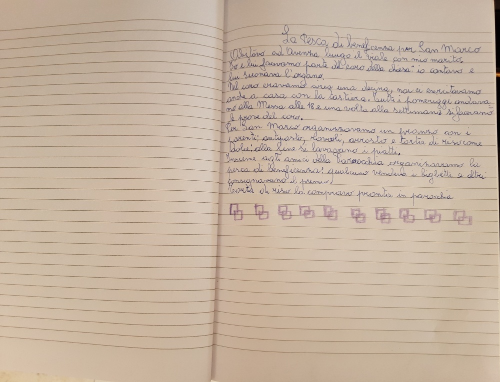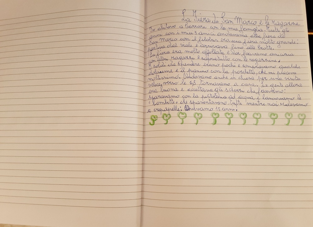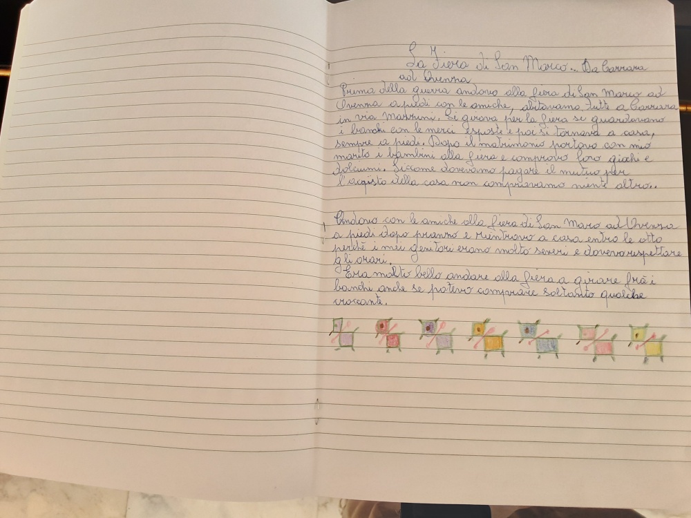 La festività del 25 aprile è ormai prossima ed i colloqui biografici del periodo, sono dedicati alla raccolta delle memorie legate alla fiera di S. Marco che si svolge tutti gli anni, da tempo immemore, ad Avenza.Gli Ospiti “Avenzini” narrano orgogliosi l'importanza delle tradizioni legate alla festività: la partecipazione alla Messa nella Chiesa di S. Pietro, con l'esibizione corale; il pranzo con i familiari riuniti per l'occasione, che terminava con la degustazione della rinomata torta di riso “all'avenzina” e la visita alla grande fiera. L'esposizione di merci e animali, è da sempre la più estesa, per numero di bancarelle, e frequentata del Comune e tutti gli Ospiti raccontano di aver preso parte all'evento sin da piccoli con i familiari, da adolescenti con gli amici e da adulti con figli e nipoti. Alcuni da Carrara o da Marina raggiungevano Avenza a piedi con gli amici oppure, qualche anno più tardi, con il filobus o la macchina.Ricordano i piccoli acquisti di dolciumi croccanti e noccioline, oppure giocattoli o ancora la pesca di beneficenza a “Casa Pellini” vicino alla Torre di Castruccio, o il panino con la porchetta…Durante il momento di condivisione, i racconti si colorano e gli Ospiti sorridono di quel tempo di festa vissuto, comune a tutti loro “…quando i soldi non erano tanti ma, tutto sembrava migliore di ora e bastava poco per essere felici…”, “…la torta di riso ad Avenza la preparano salata …”La solennità del 25 aprile di Avenza, festa liturgica in occasione del martirio di San Marco, affonda le sue radici nell'antichità: l'allora borgo di Avenza, legato da secoli alla allora Diocesi di Luni, ne erediterà parte del patrimonio spirituale intitolando la Chiesa a San Pietro e proclamando San Marco protettore del paese. Nella Chiesa, le statue in marmo dei due santi, capolavori del ‘500, sono poste ai lati dell'altare maggiore mentre sulla facciata dell'edificio, si trova lo stemma vescovile con la mezzaluna.La coincidenza della solennità religiosa con quella della festa della Liberazione, ha rafforzato le tradizioni, fondendo l'antico con il moderno e, per il territorio comunale è la festa di primavera di maggior successo che i nostri Ospiti conservano nel loro cuore.
