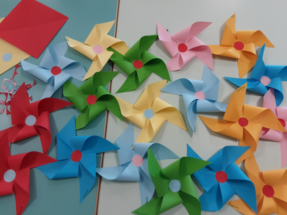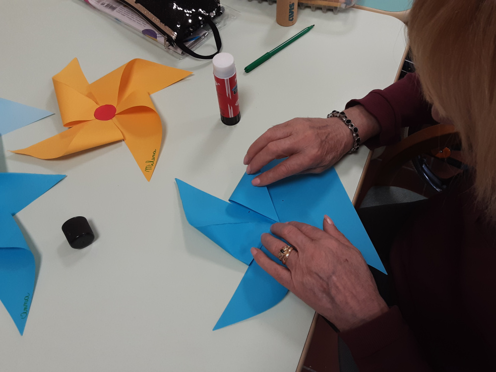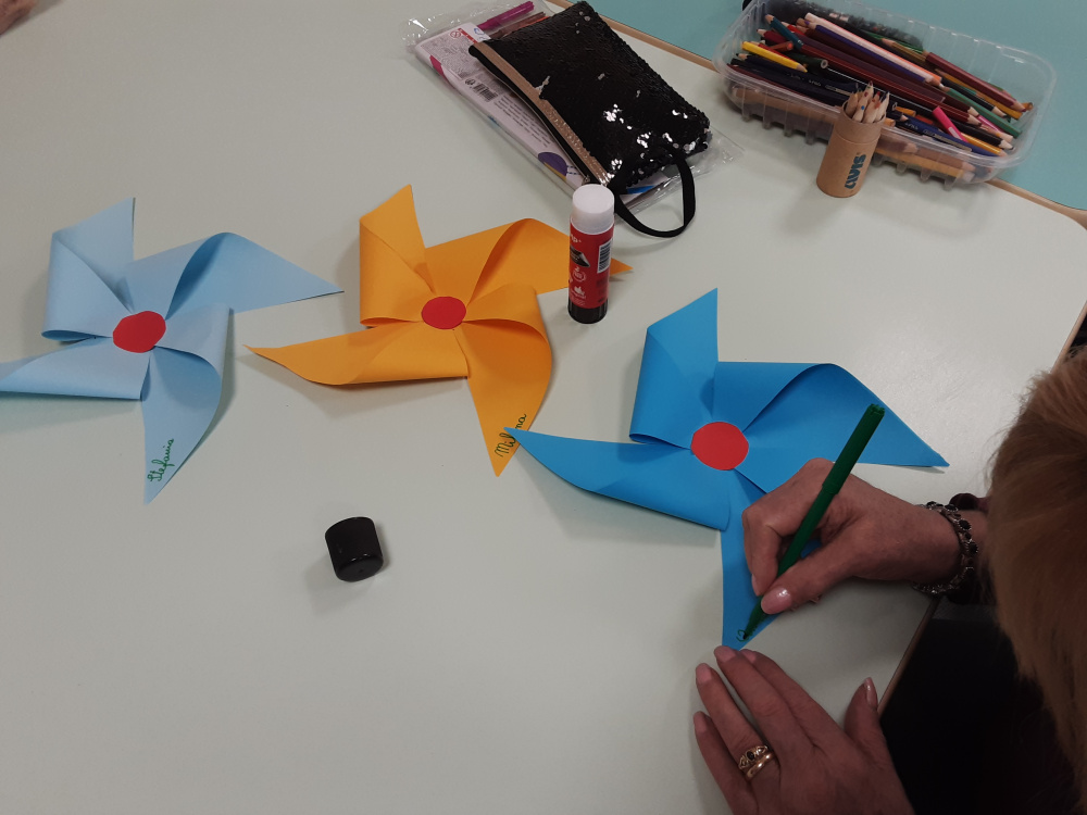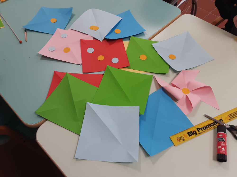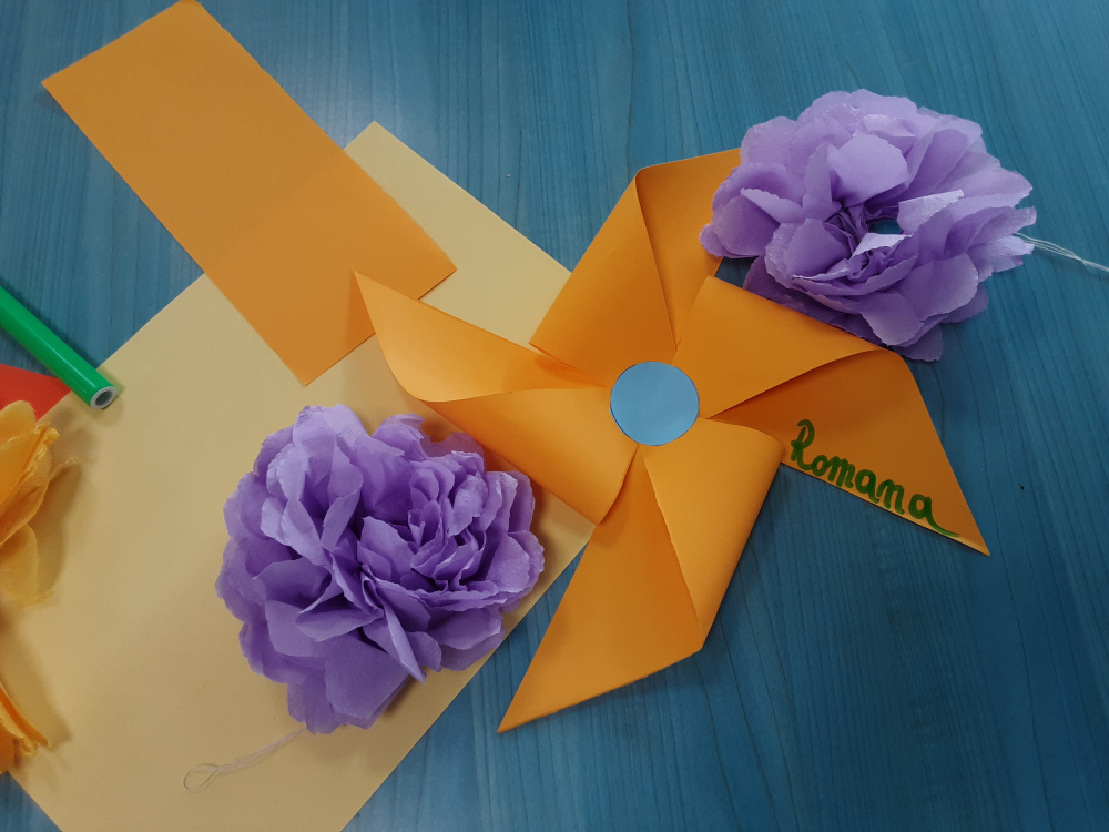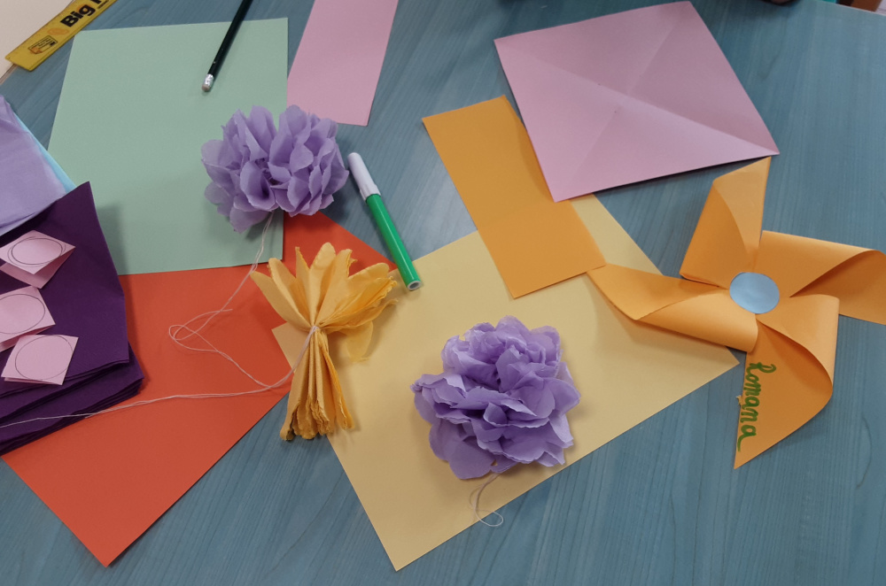 Stimolati ed incuriositi dalle nuove esperienze, i componenti del gruppo si impegnano a fondo per realizzare vivaci rose di carta, girandole, farfalle, …