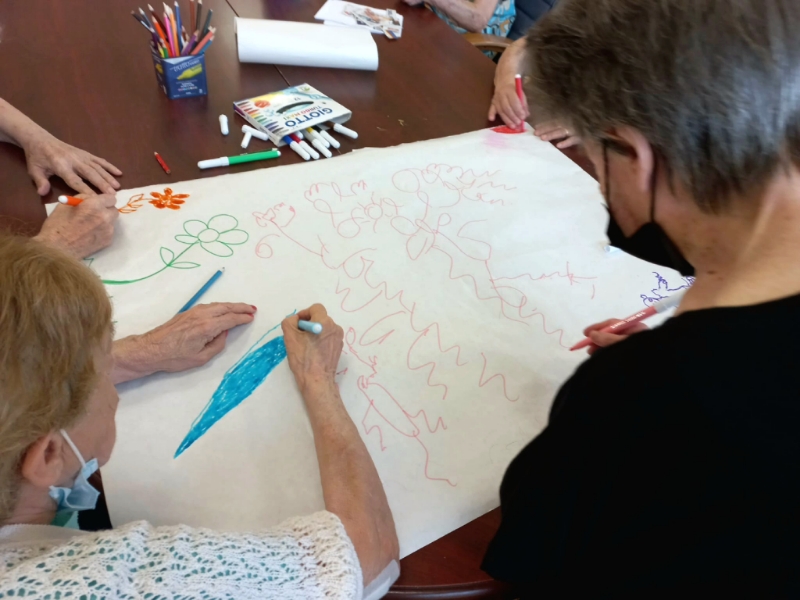 Raccontiamo l’estate (potete trovare alcuni dei lavori realizzati dagli ospiti nelle foto qui accanto) la stagione che vede protagonista il mare in molte memorie raccolte. "Andavo a pescare in barca"- dice Alberto- "prendevo le seppie, tante", "mi piaceva molto il mare- interviene Maria- anche se non sapevo nuotare", "andavo al mare in filobus, con mia sorella Anna Lia, che è molto più piccola di me"- aggiunge Nedda. E mentre Jose ricorda una meravigliosa gita in traghetto, a Portovenere con le sue colleghe, Brunetta ci porta sulle spiagge dell’Oceano Atlantico, a Mar del Plata, in Argentina, dove ha trascorso gli anni della prima giovinezza; e Francesca ci conduce all’isola Palmaria, nella quale ha passato una settimana a pescare e a nuotare. E non mancano, per finire, ricordi squisitamente apuani: "noi ragazzi facevamo il bagno nel Carrione", "alla domenica andavamo a Campocecina",, "passeggiavamo in via Roma, alla sera, e nascevano anche degli amori".