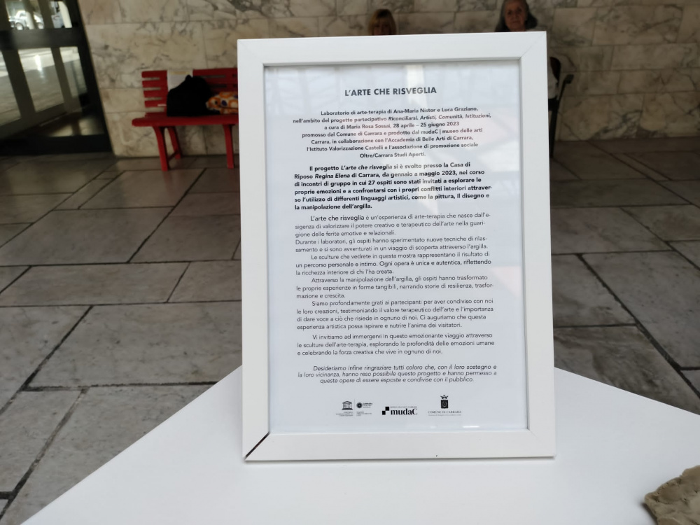 Nella giornata di venerdì 26 maggio, una rappresentanza dei nostri Ospiti, è stata accompagnata dalla nostra direttrice, Dott.ssa Antonella Cordiviola, alla presentazione degli elaborati plastici realizzati, installati nell'Atrio del Comune di Carrara ed in quell'occasione tra le autorità presenti, la direttrice del museo Mudac, Dott.ssa Laura Barreca ha portato i suoi saluti e le sue lodi per le opere esposte in quella sede. Sabato 27 maggio a partire dalle ore 10:30, ha avuto luogo in struttura l'inaugurazione della mostra “L'arte che risveglia” alla presenza della direttrice, della Dott.ssa Menichetti M. Grazia in rappresentanza del Consiglio di Amministrazione, dell'Assessore alla Cultura del Comune di Carrara Dott.ssa Gea Dazzi, della curatrice del progetto M. Rosa Sossai, del rappresentante della associazione Oltre/Carrara Studi Aperti e dei conduttori del laboratorio che sono intervenuti, portando i loro saluti ed il loro compiacimento. Il laboratorio di arte-terapia di Ana Maria Nistor e Luca Graziano, nell'ambito del progetto partecipativo “Riconciliarsi Artisti, Comunità, Istituzioni” a cura di A. Maria Sossai, promosso dal Comune di Carrara e prodotto dal Mudac/museo delle arti Carrara, in collaborazione con l'Accademia di Belle Arti di Carrara, l'Istituto Valorizzazione Castelli e l'associazione di promozione sociale Oltre/Carrara Studi Aperti., si è tenuto in struttura da gennaio a maggio 2023. I due giovani conduttori illustrando il progetto e la sua realizzazione, hanno raccontato come si sia creata una sintonia fra loro stessi e gli Ospiti, le animatrici e l'arte e come negli incontri di gruppo, i partecipanti hanno “respirato l'arte”, ricevendo benessere, gioia e serenità. La loro esperienza accanto ai gruppi di lavoro, ha favorito la possibilità di far loro esprimere il mondo interiore tramite varie tecniche pittoriche o plastiche. Durante la cerimonia, gli Ospiti hanno ricevuto la consegna della cartella personale con gli elaborati realizzati, che li ha particolarmente emozionati. I familiari presenti hanno potuto ammirare la mostra allestita con le realizzazioni create dai loro cari, disposte sulle pareti del salone. Tutte le opere sono inoltre contenute nel catalogo. L'atmosfera del salone è stata resa magica dall'esecuzione di brani di musica classica, eseguiti al pianoforte dal valente giovane Matteo Mariotti, sullo scorrere a video del filmato dei laboratori. A conclusione dell'evento, è stato offerto un ricco buffet degustato negli spazi anche esterni della struttura. Questa importante manifestazione che si è svolta dopo il periodo di isolamento imposto dalla pandemia Covid-19, è il miglior augurio per una strada aperta a vari e successivi eventi attesi e da sempre apprezzati, dai nostri Ospiti.