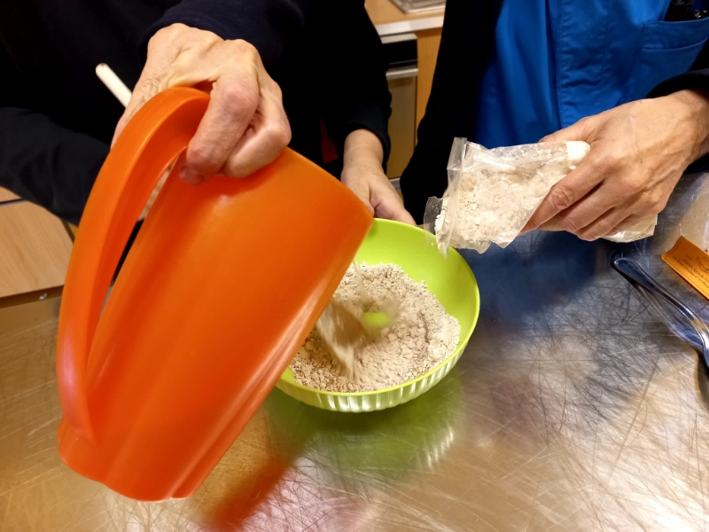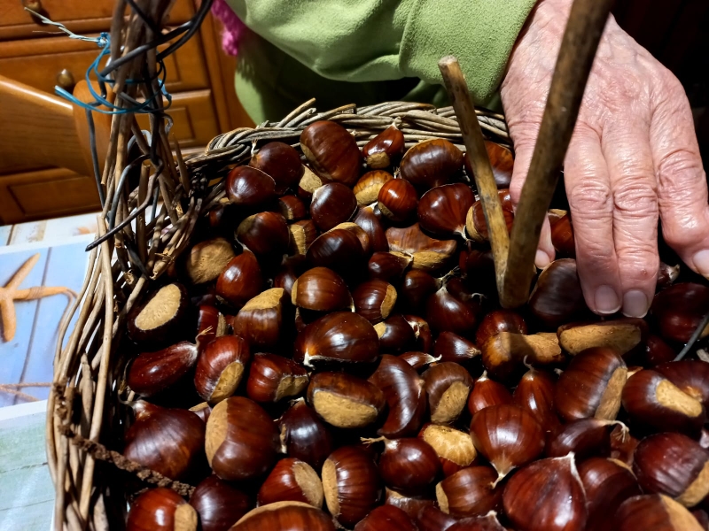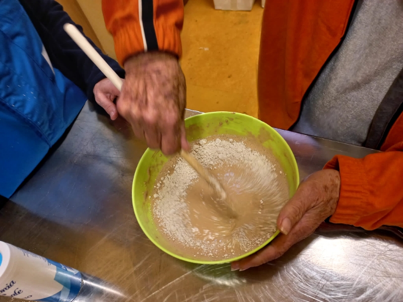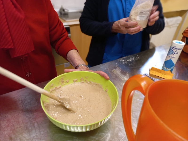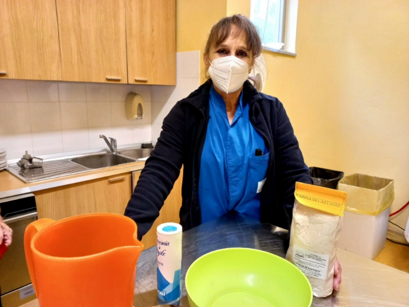 Occorrono soltanto acqua, un pizzico di sale e farina. Di castagne. Rosanna, operatrice del Centro diurno Alzheimer, insieme a un gruppo di ospiti, prepara l’impasto, della giusta consistenza né troppo liquido né troppo denso, lo versa a cucchiaiate in padella, poi lo gira per completarne la cottura da entrambi i lati, et voilà frittelle di castagne e bollenti, come si chiamano da queste parti, con l’aggiunta di ricotta fresca, sono pronti per una golosa merenda.