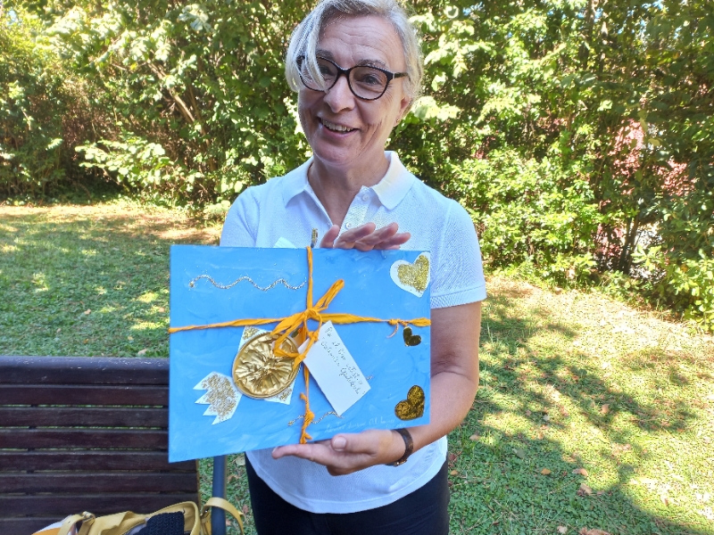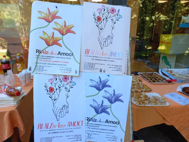 In occasione dell’evento gli ospiti del Centro Alzheimer hanno confezionato per il buffet una torta di mele e ringraziato i partecipanti con parole scritte da loro; a Rebecca e Christian hanno consegnato un biglietto personalizzato e ai rappresentanti delle istituzioni quadretti di loro produzione.