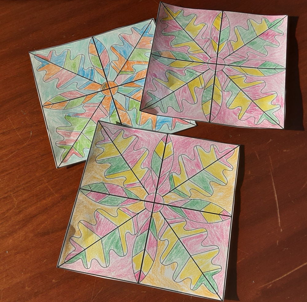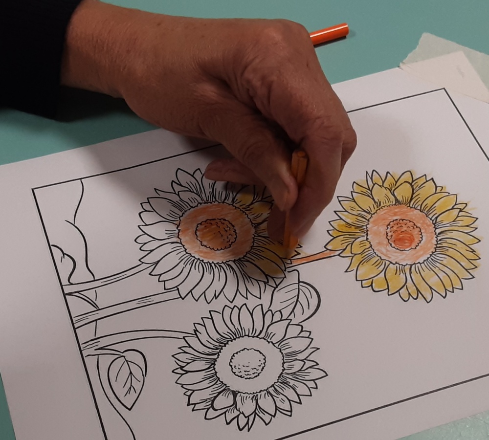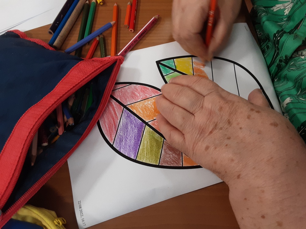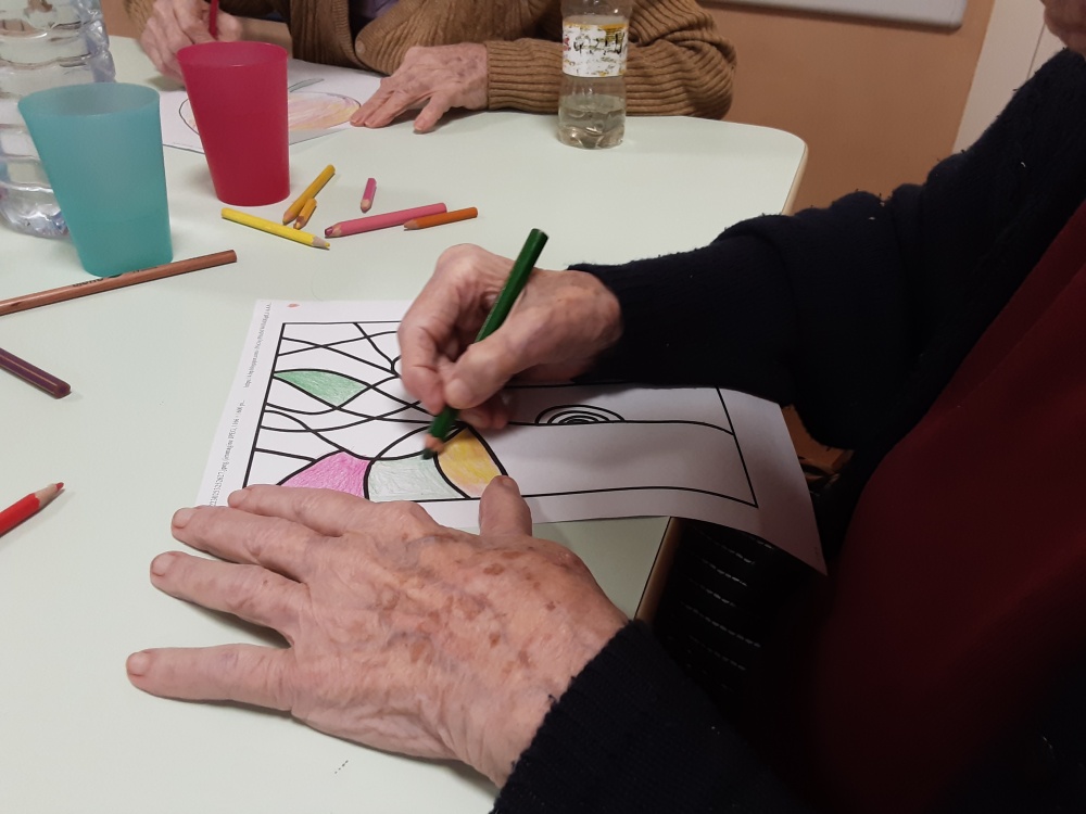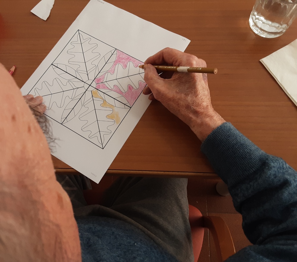 Alcuni ospiti hanno ottenuto composizioni cromatiche o, decorato con cornici, i quadretti eseguiti dai “pittori” con palline ottenute dalla manipolazione della carta crespa, altri si sono dedicati a colorare singole mattonelle successivamente unite per ottenere un grande collage.