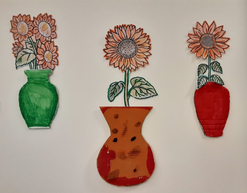 Nei vasi, dipinti con pennellate materiche decise e cariche, i girasoli sono disposti in modo armonioso, alla maniera di Van Gogh: alla ricerca della felicità …come il sole alla ricerca del sole.