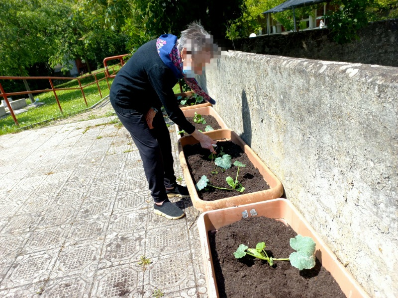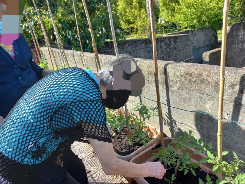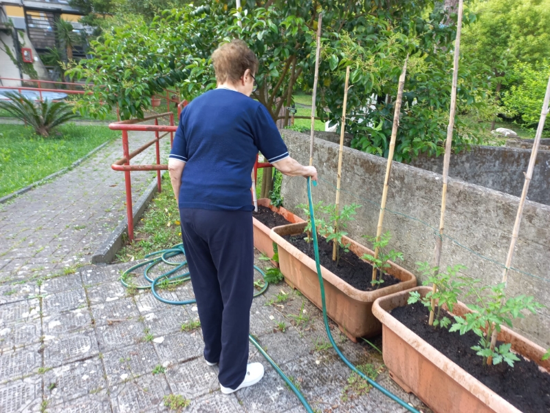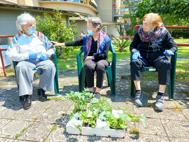 La cura quotidiana delle piantine, a misura delle capacià fisiche di chi vi prende parte, e l’osservazione della loro crescita motivano gli ospiti in un impegno che produce benessere e li inserisce dinamicamente in un processo vitale. L’attività di orticoltura stimola nei partecipanti le capacità manuali e cognitive e soprattutto attiva autostima e autoefficacia, creando una attesa paziente dei risultati del proprio lavoro, sul quale viene rinnovata ogni giorno attenzione e concentrazione. E mentre si annaffiano le piante, si sorregge la loro crescita, se occorre, legandole a dei sostegni, la memoria può correre agli orti di gioventù e la conversazione incentrarsi su consigli per coltivazioni di successo, dando vita a momenti di socializzazione, di condivisione e di confronto.“Possiamo conservare i fondi del caffè- dice Marisa- un concime naturale”, “vedere queste piantine crescere sane- aggiunge Gabriella- dà gioia al cuore”, “appena le zucchine sono pronte- intervengono Maria e Maria Grazia- prepariamo una bella torta! ”. Come negli scorsi anni, infatti, i frutti dell’ orto diventeranno ingredienti di semplici ricette per realizzare, nei laboratori di cucina, gustose merende.