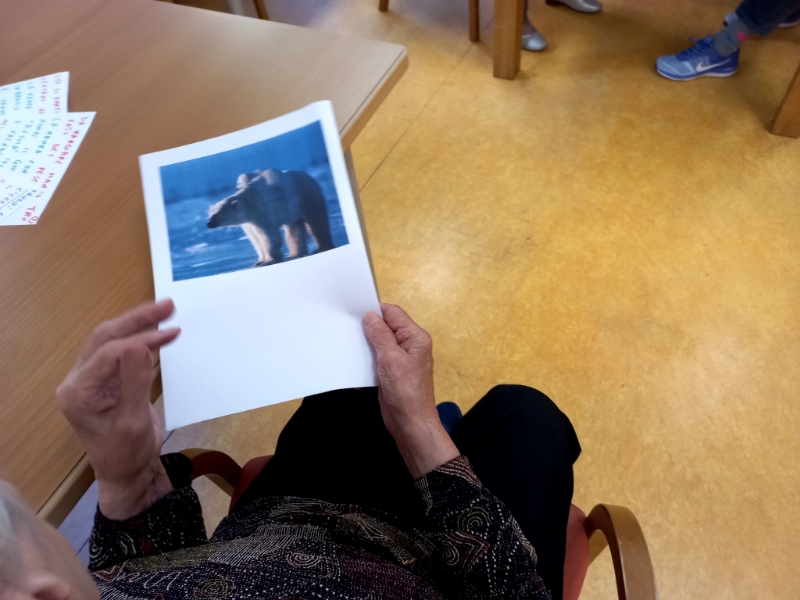 Time slips -Il tempo scorre- è un metodo di scrittura creativa, nato negli anni novanta all’Università del Wisconsin da un progetto rivolto a pazienti con demenza, al fine di coltivare immaginazione e creatività nei casi in cui le capacità cognitive, in particolare quelle mnemoniche, risultavano compromesse. L’attività di Time slips, che piace molto ai nostri ospiti, ha inizio dalla visione di un’immagine priva di riferimenti a contesti familiari e quotidiani – noi abbiamo scelto una foto di orsi con un cucciolo in una banchina polare- per favorire al meglio l’immaginazione che, svincolata da confini emotivi e richiami autobiografici, può muoversi liberamente in un terreno inesplorato. Nella successione degli interventi, spontanei o stimolati da domande aperte, la storia prende corpo e diventa sintesi corale delle singole espressività. Time slips è un’affascinante opportunità di comunicazione, capace di soddisfare i bisogni di interazione e di inclusione degli ospiti, dove ogni espressione è accettata e trascritta così come viene esternata, nella sua unicità, senza correzioni o aggiustamenti, e confluisce in un testo a volte frammentato e incompleto, ma sempre autentico. La storia, una volta terminata e firmata a nome di tutti, viene letta al gruppo, che applaude al lavoro comune e ne sceglie il titolo. La mamma orsa è quello suggerito da Cristina per la nostra storia, che vi invitiamo a leggere nella foto di copertina.